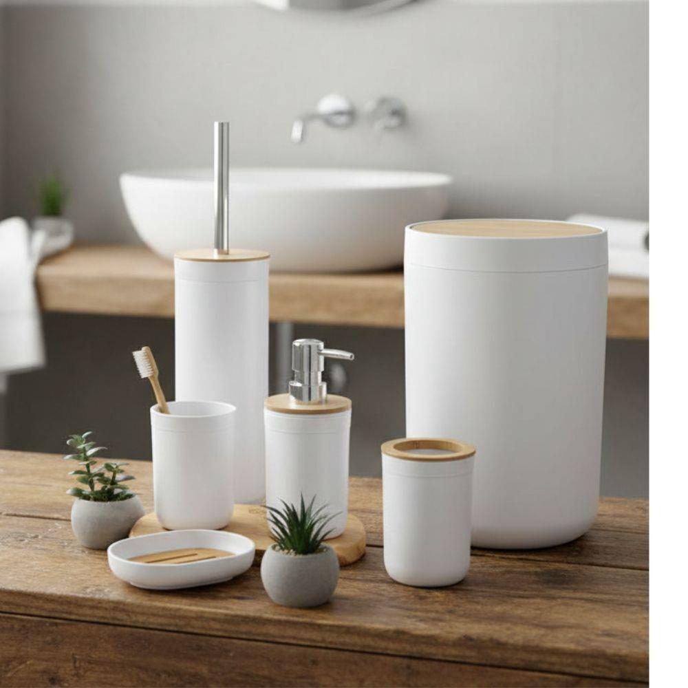 Căutați accesorii moderne și elegante pentru baie? Tocmai le-ați găsit. Acest set conține tot ce nu trebuie să lipsească din nicio baie – un dozator de săpun, un suport de săpun, pahare pentru periuțe de dinți/gargară, un coș de gunoi și o perie WC.