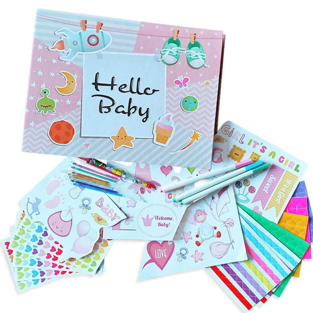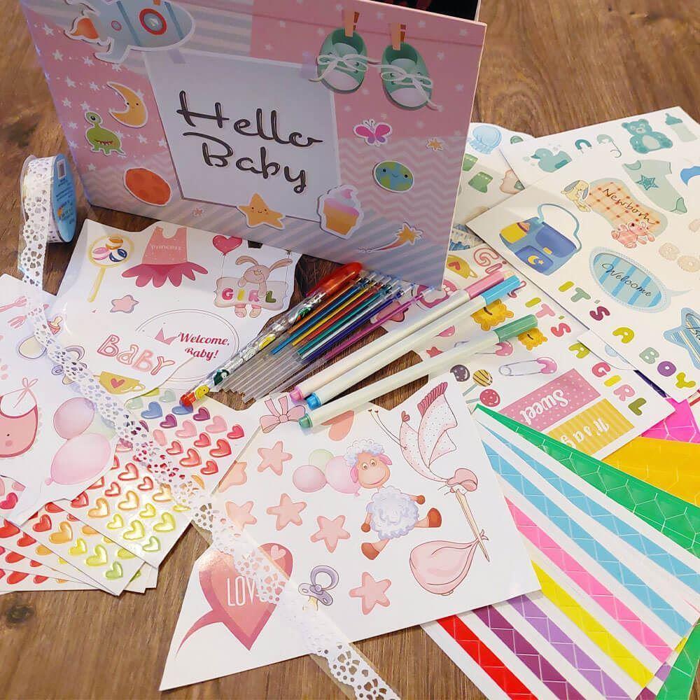 Pachetul conține tot ce vă este necesar pentru a înfrumuseța jurnalul. Datorită colțurilor autoadezive, puteți lipi ușor fotografii, cărți poștale sau ecografii în interior. În jurnal puteți să scrieți, să desenați și să decorați paginile cu ajutorul abțibildurilor adorabile.