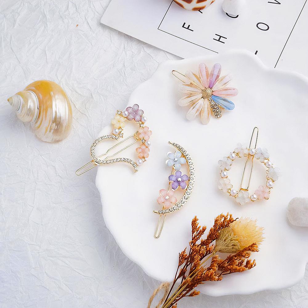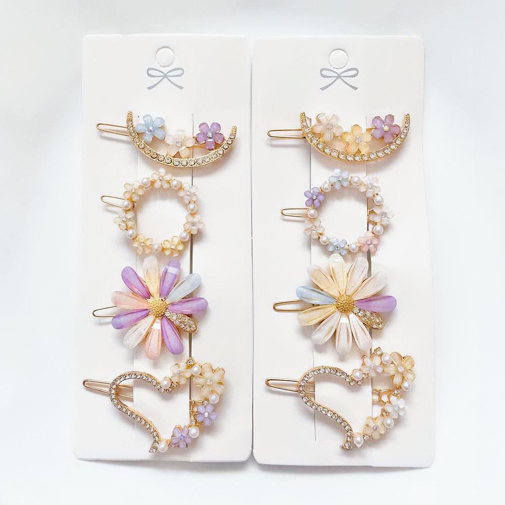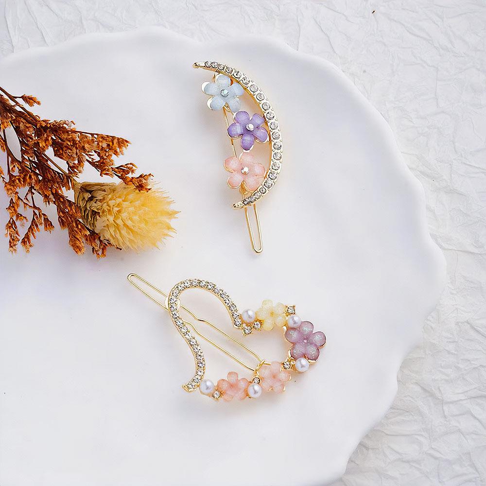 Agrafele de păr cu flori și pietricele, în set de patru bucăți, sunt un accesoriu delicat și elegant care oferă coafurii un aspect unic. Fiecare agrafă are o formă diferită – printre ele vei găsi o inimioară decorativă, o lună, o coroniță florală și o margaretă pastelată.
