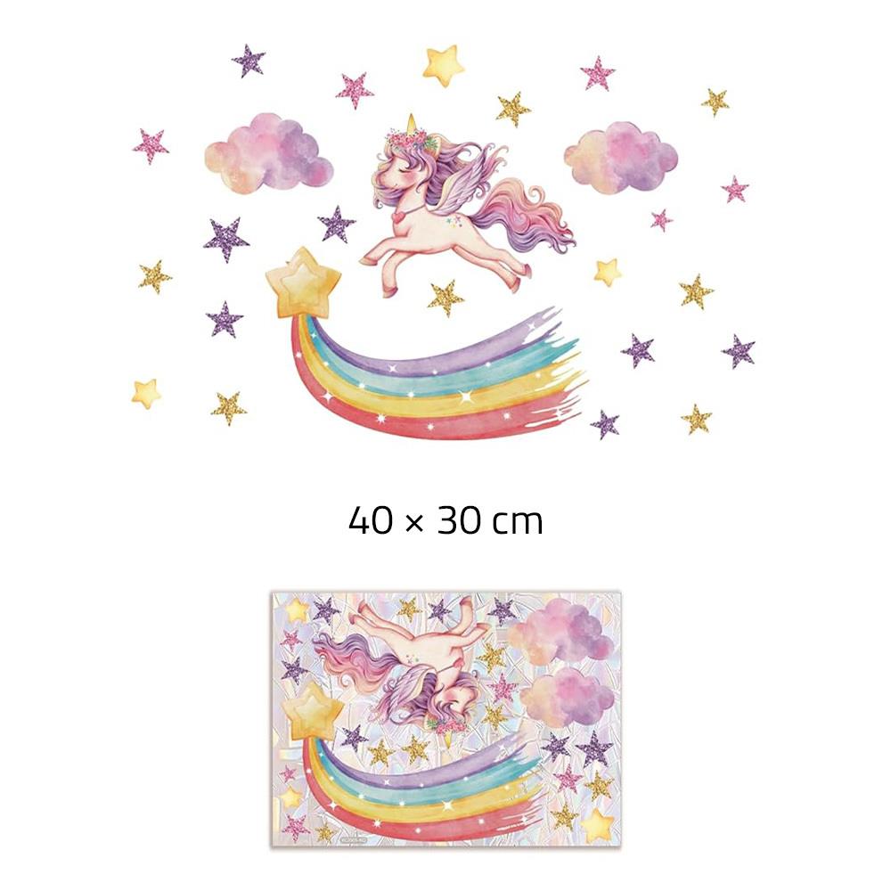 Autocolantul decorativ pentru fereastră cu motiv de unicorn este o decorațiune magică ce transformă o fereastră obișnuită într-o lume plină de culoare și fantezie. Pe coală vei găsi un unicorn drăgălaș, steluțe, norisori și un curcubeu, așa că poți crea o compoziție veselă exact cum îți dorești.