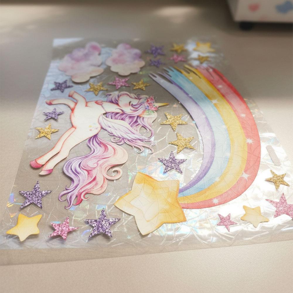 Autocolantul este aderent și nu necesită lipici, astfel că îl poți aplica ușor pe sticlă și să îl îndepărtezi fără urme ori de câte ori ai nevoie. Însă adevărata magie apare atunci când razele soarelui îl luminează – autocolantul creează reflexii irizate care luminează frumos camera și creează o atmosferă jucăușă. O decorațiune perfectă pentru camera copiilor, sala de joacă sau fereastra micilor iubitori de unicorni.