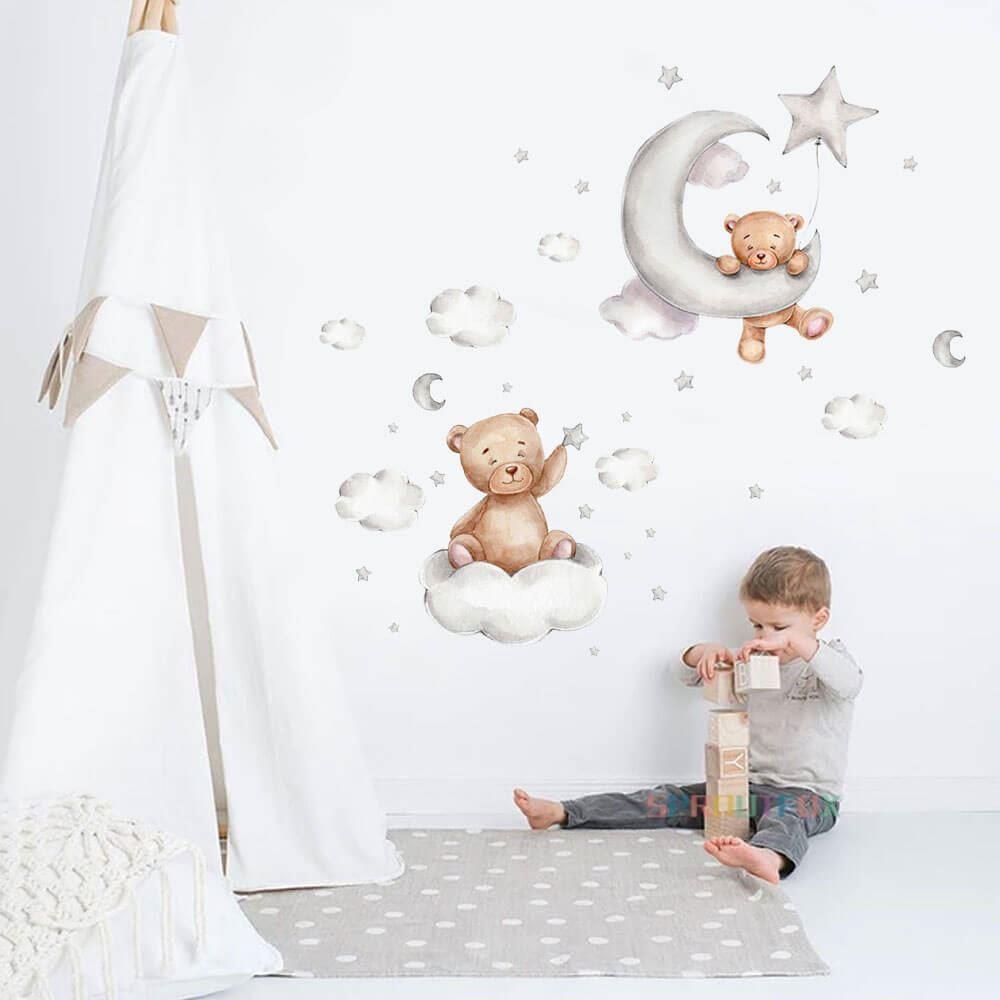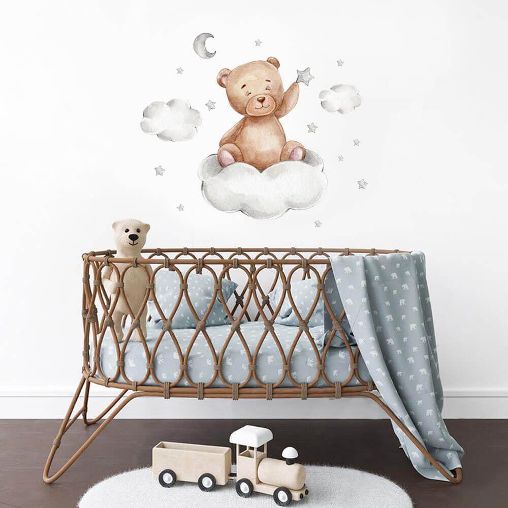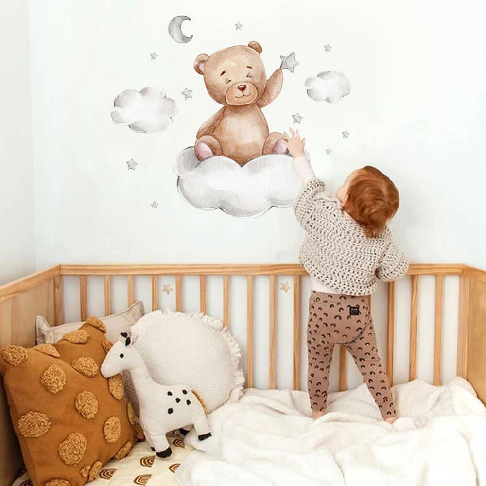 Duceți decorarea camerei copilului la perfecțiune absolută! Acest set cu ursuleț drăgălaș, norișori și steluțe va încânta orice mic iubitor de ursuleți. Poziționarea ideală este chiar deasupra pătuțului copilului. Ursulețul va veghea asupra micuțului și îl va însoți la somn. Stickerul cu ursulețul va stimula frumos imaginația copilului atât la culcare, cât și în timpul jocului.