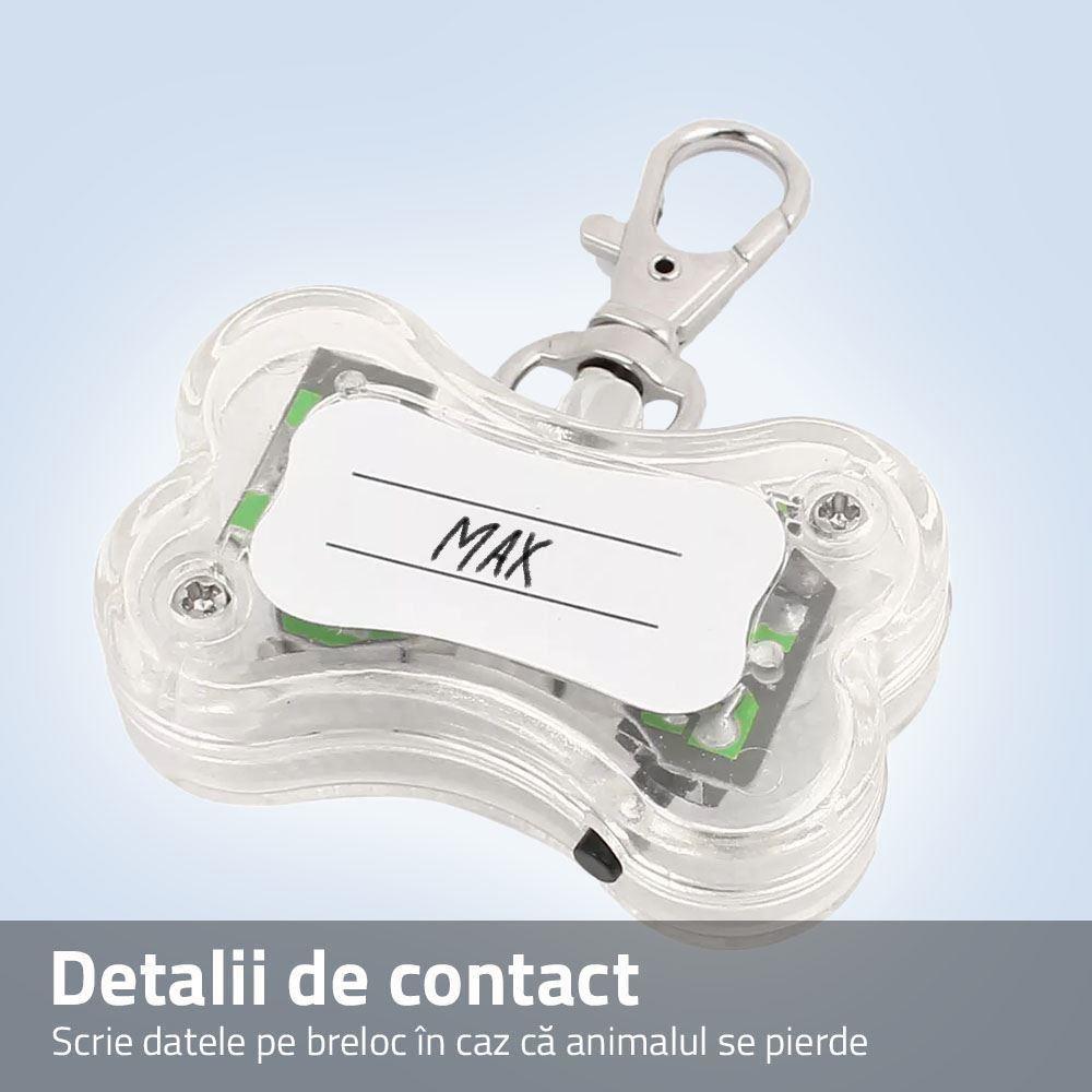 Brelocul LED luminos pentru zgardă este un accesoriu esențial pentru toți proprietarii de câini care doresc să asigure siguranța animalelor lor de companie în timpul plimbărilor de seară și dimineață pe întuneric. Acest breloc practic nu doar că crește vizibilitatea animalului datorită celor trei moduri de iluminare, dar oferă și posibilitatea de a scrie numele și detaliile de contact pe spatele său, în caz că animalul se rătăcește.