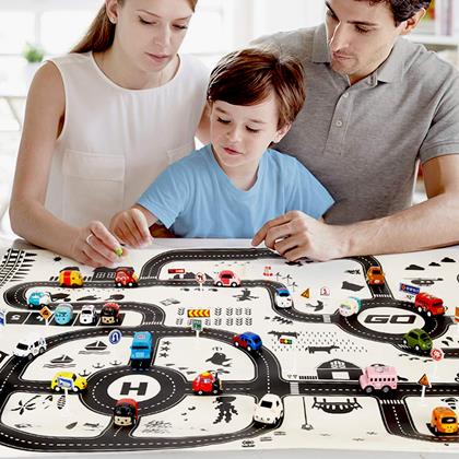 Covorul de joacă este iubit mai ales pentru motivele pe care le afișează. Motivele de transport și mașinuțele sunt foarte populare, nu doar pentru băieți. Avantajul covorului este că "crește" odată cu copilul. Se pot juca atât cu diferite jucării interactive, cât și cu mașinuțele pe traseele marcate de pe covor. În pachet sunt incluse semnele de circulație și autocolante care pot fi lipite pe covor.