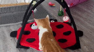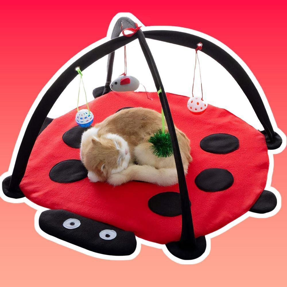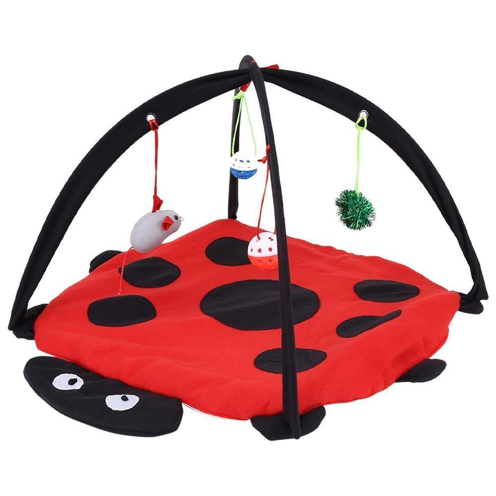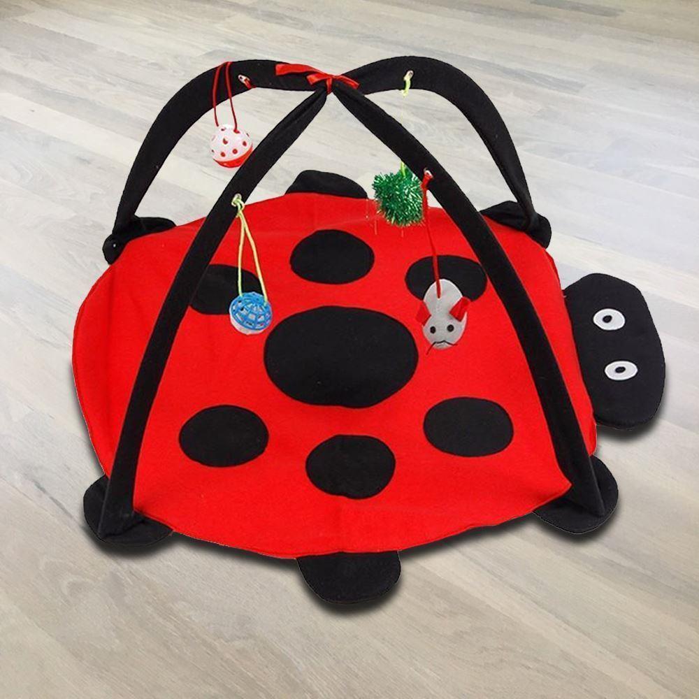 Pisicile și mai ales pisoiașii caută mereu stimulente pentru joacă. Covorașul de joacă pentru pisici oferă spațiu ideal pentru distracție și amuzament pentru felinele dumneavoastră. Covorașul are o construcție pliabilă pe care sunt atârnate jucării preferate de pisici, cum ar fi un șoricel de pluș, ciucuri verzi sau mingiuțe cu clopoței. Materialul fleece este foarte plăcut la atingere, iar întregul covoraș este confeționat într-un design de buburuză, astfel încât va arăta minunat în interior ca și element decorativ.
