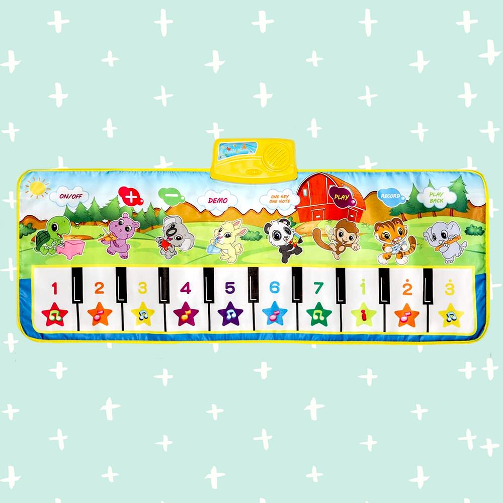 Covorașul de joacă este cu adevărat o experiență muzicală pentru copiii dumneavoastră! Cui dintre cei mici nu-i plac jucăriile cu sunete? Cei mai mici nu se pot desprinde de sunete, iar pentru cei mai mari este cel puțin o provocare. Cu ajutorul pianului, își pot încerca talentul de compozitor. Pianul vesel și colorat oferă mai multe animale, iar prin apăsarea pe animal, cântați cu instrumentul alocat acestuia. Pe lângă aceasta, covorașul de joacă oferă și alte butoane interesante. Copiii pot regla volumul sunetelor, reda diverse melodii înregistrate sau pot înregistra melodii noi.