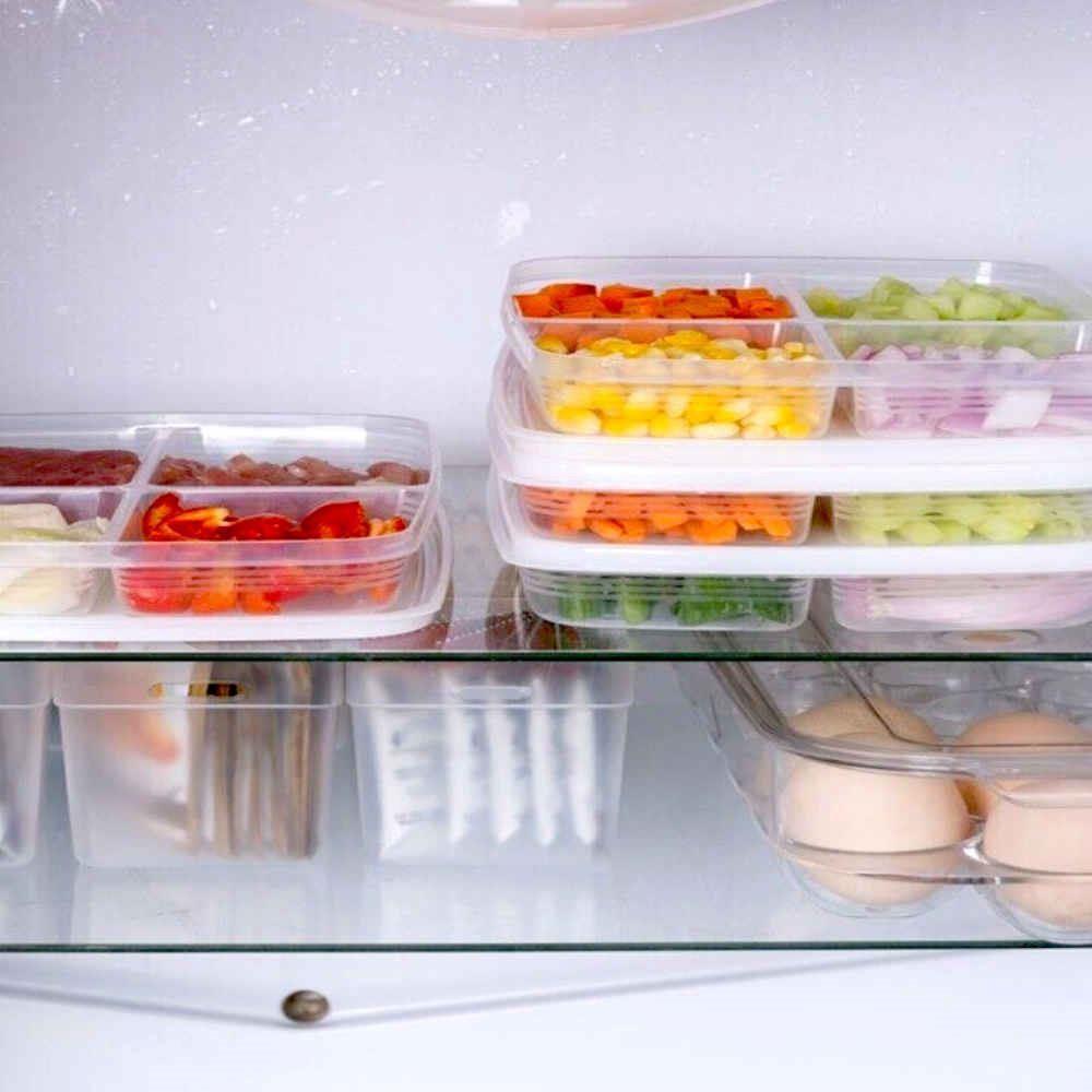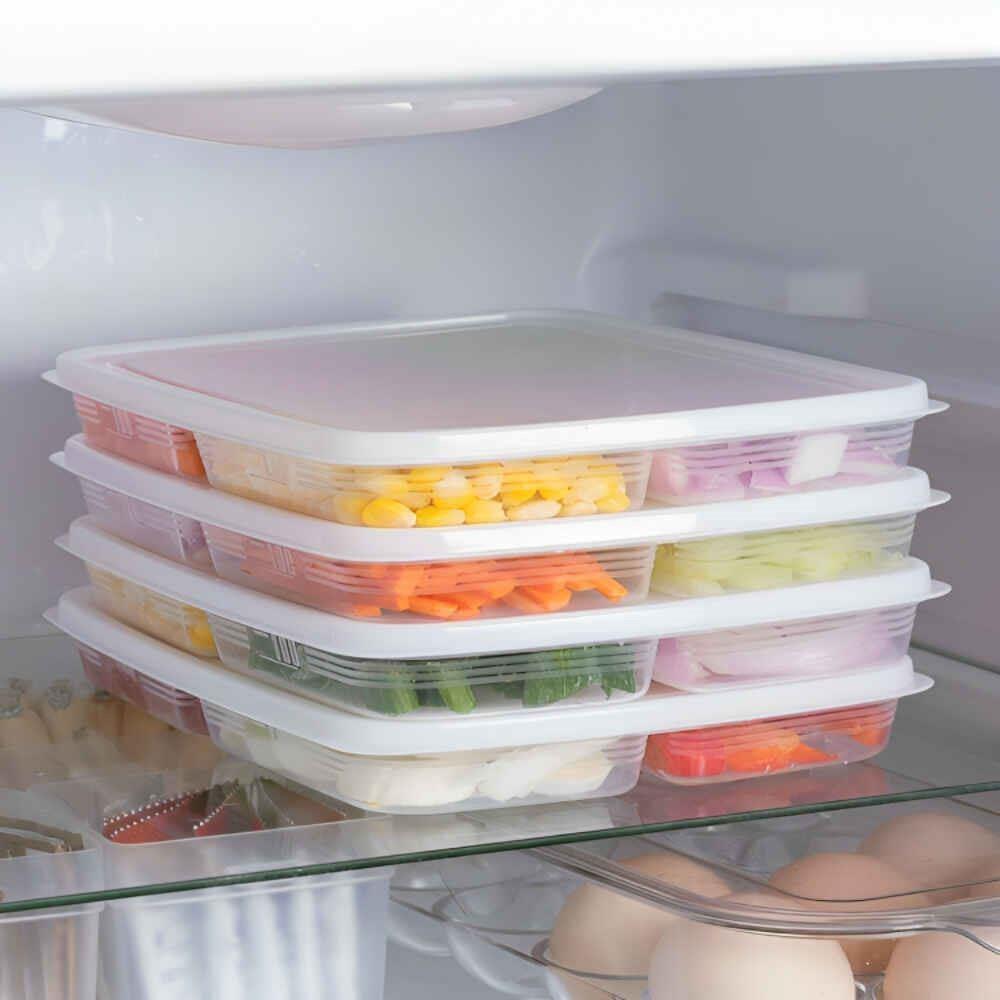Recipientul compartimentat este un accesoriu de bucătărie excelent dacă te lupți cu timpul pentru gătit. În cutia de plastic poți să pre-tai legumele, carnea sau alte ingrediente, iar după muncă doar le răstorni în tigaie și cina este gata!
