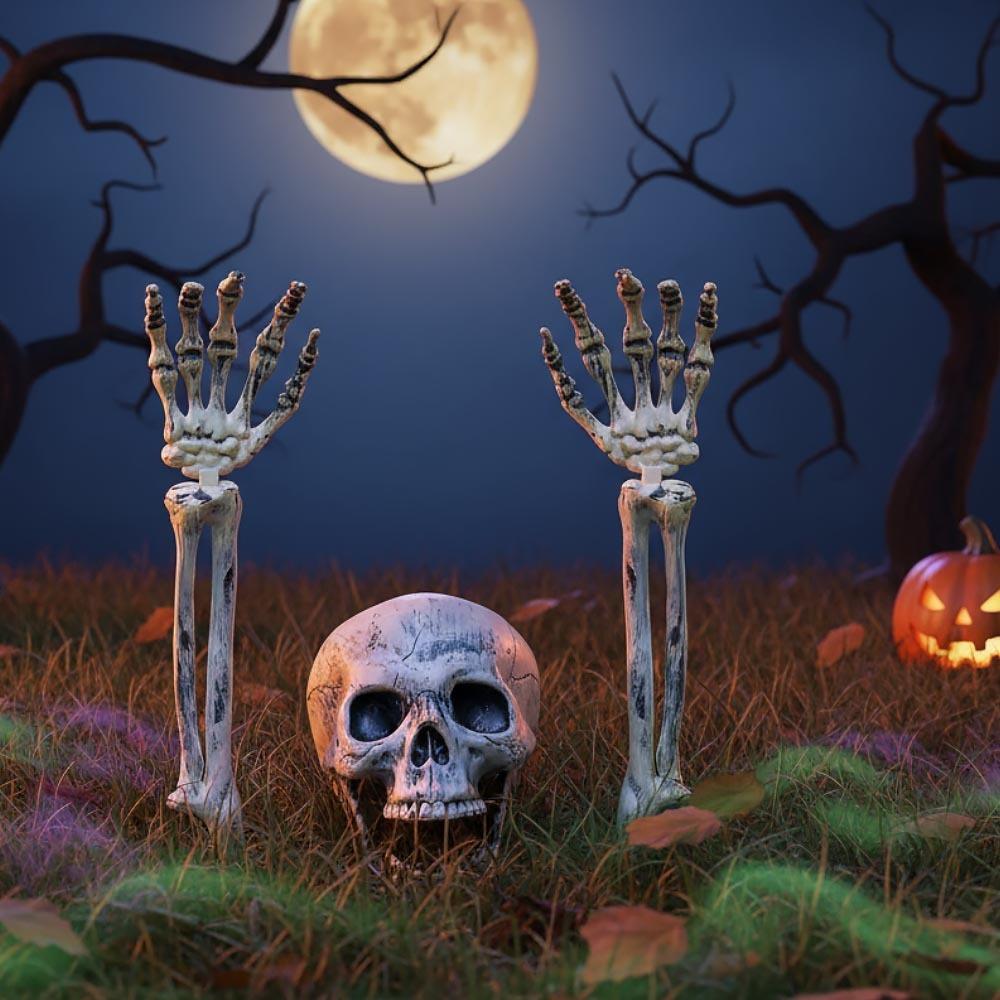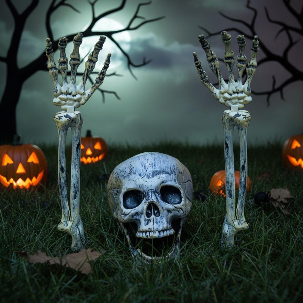 Vântul şuieră prin câmpuri și simțiți deja în aer că este din nou acea perioadă înfricoșătoare, dar și magic de amuzantă, a Halloweenului? Dacă, în plus, țineți la o decorare cu adevărat fantomatică, avem ceva special pentru dvs.! Va speria și va amuza, și cine este acesta? Scheletul care se ridică din pământ! Din locuința sa s-a strecurat la lumina zilei pentru a anunța tuturor că a sosit sărbătoarea înfricoșătoare. Cu toate acestea, știți că nu trebuie să vă temeți, astfel încât puteți aranja scheletul în diverse moduri și să-l mutați exact acolo unde va face cel mai mare spectacol înfiorător. Înfigeți-l, de exemplu, lângă drumul către casa dvs., unde va întâmpina colindătorii de Halloween, dar va speria și vizitatori neștiutori. Puteți să-i îndoiți brațele osoase sau să ajustați zâmbetul mișcând în balamale. Îi puteți adăuga, de asemenea, câteva accesorii elegante, cum ar fi o pălărie, și să-i puneți ceva în mâini, pentru a arăta că scheletul este al dvs.