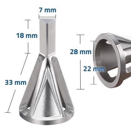 Unealtă pentru îndepărtarea bavurilor – un instrument durabil – special conceput pentru reparații și ajustări ale șuruburilor și marginilor diferitelor materiale. Această unealtă oferă durabilitate excelentă, proprietăți anticorozive și o durată lungă de viață. Utilizarea sa sigură și eficientă asigură îndepărtarea ușoară a bavurilor și marginilor ascuțite fără riscul de accidentare. Se atașează simplu la capătul unei bormașini și poate debavura o gamă largă de materiale, de la metale până la plastic. Este un ajutor indispensabil în atelierul de acasă și în mediul meșteșugăresc. Unealta pentru îndepărtarea bavurilor este potrivită pentru șuruburi și tije de la 8 la 19 mm. Manipularea lentă cu bormașina asigură rezultate sigure.