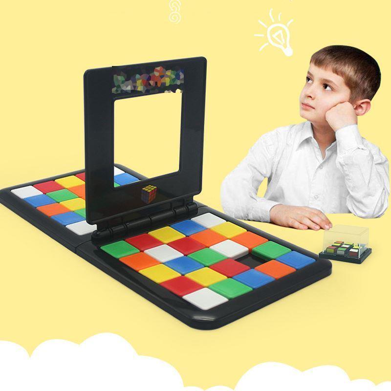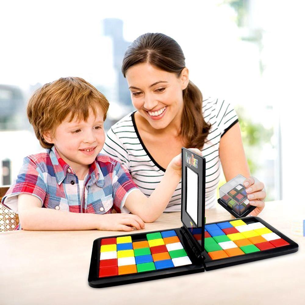 În cel mai scurt timp, trebuie să reușiți să asamblați aceeași combinație de culori ca cea de pe cubul model. Combinația de culori trebuie să fie în centrul unei suprafețe de 3x3 cuburi. De îndată ce ați terminat, închideți capacul și adversarul va vedea dacă combinația voastră se potrivește cu cea model. Dacă da, sunteți câștigătorul jocului Cub Rubik pentru 2. Provocați familia la un duel și testați-vă memoria.