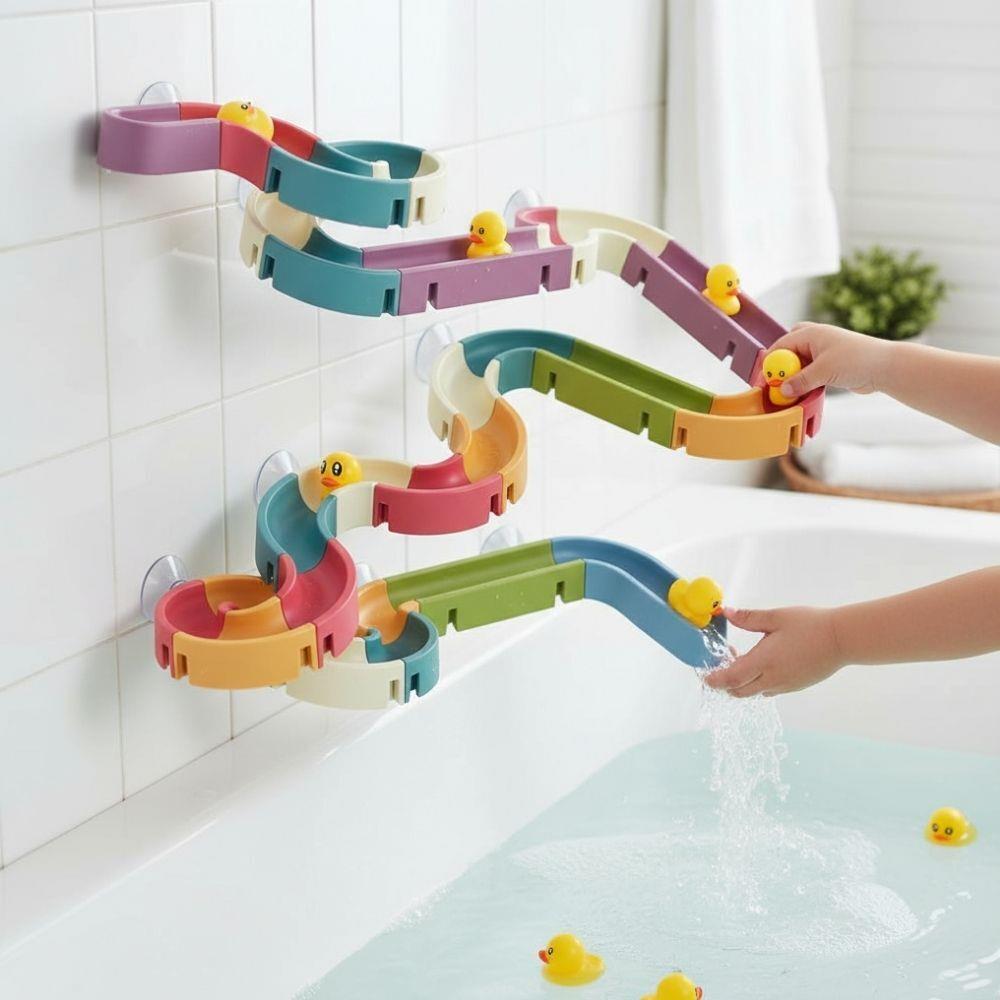 Construiți-vă un tobogan colorat și lăsați rațele să alunece direct în cadă! Vă veți distra de minune în apă. Toboganul are multe piese, astfel încât să puteți pregăti o pistă diferită de fiecare dată pentru rațe. Piesele sunt ușor de conectat între ele și, datorită ventuzelor, toboganul poate fi fixat pe faianță, sticlă și anumite tipuri de plastic. 2 sau mai multe seturi de jucării pot fi conectate – astfel veți crea un tobogan destul de lung.