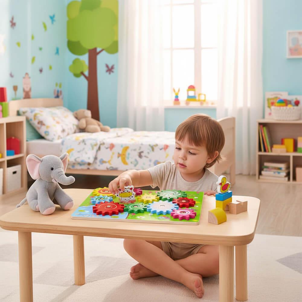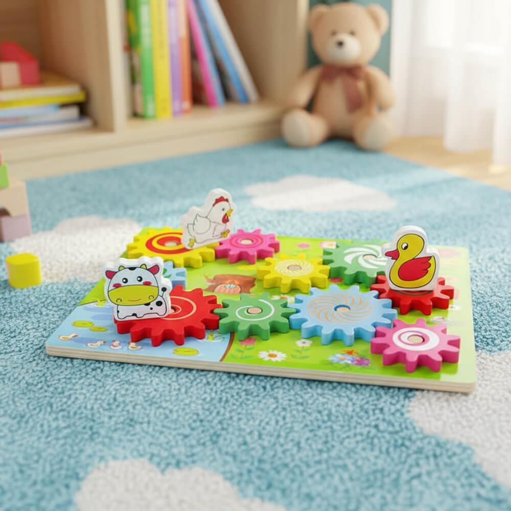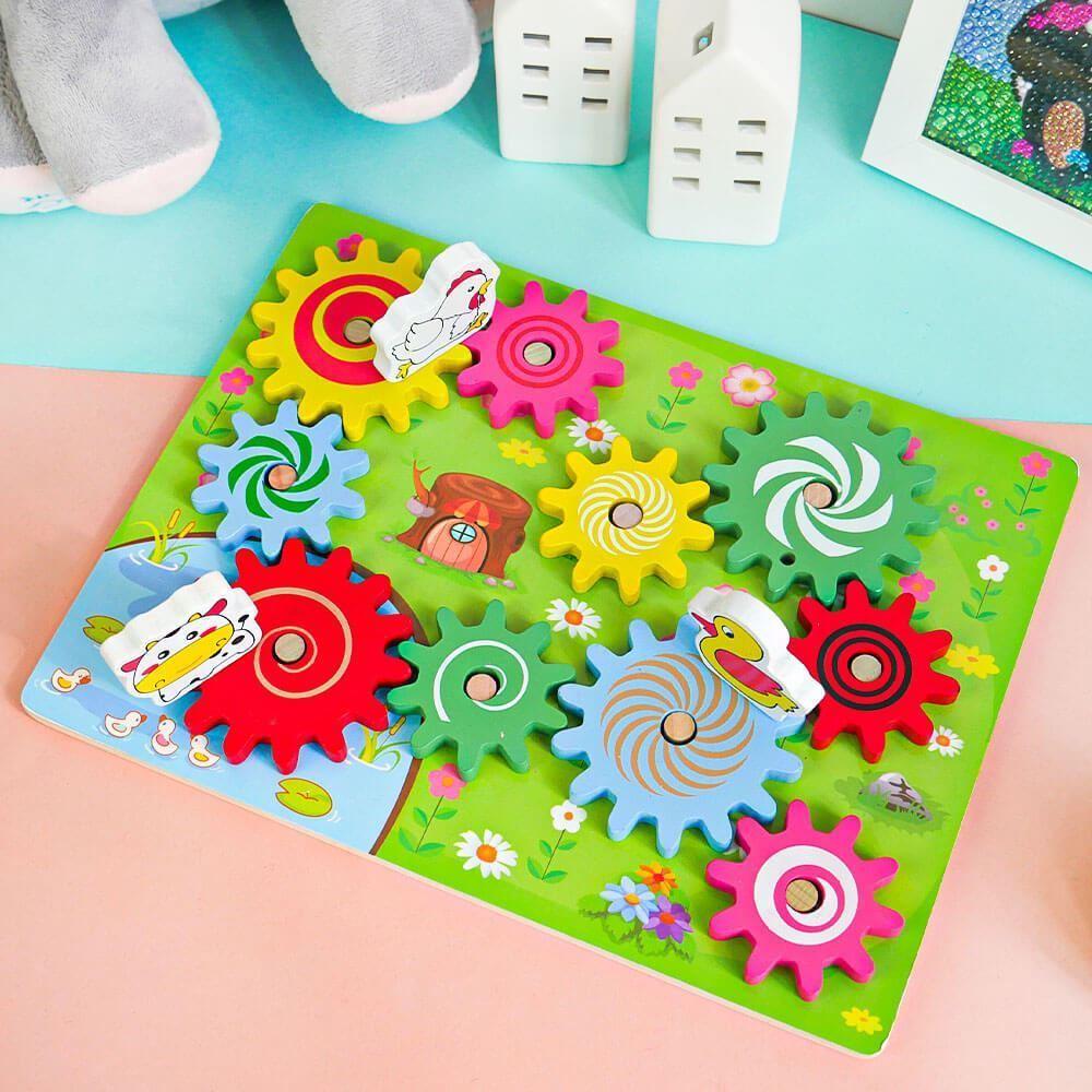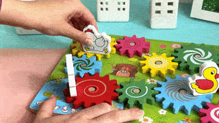 Puneți roțile dințate pe placă, apoi se atașează animăluțele pe roțile mari dințate. Dacă începeți să rotiți unul dintre animăluțe, va mișca roata pe care este plasat, ceea ce va face ca toate roțile dințate din apropierea sa să înceapă să se miște. Roțile mici și mari de diferite culori pot fi ușor mutate sau asamblate. Datorită acestui fapt, micuțul dumneavoastră își va dezvolta gândirea creativă, motricitatea și distracția va fi asigurată pe parcursul întregii zile.