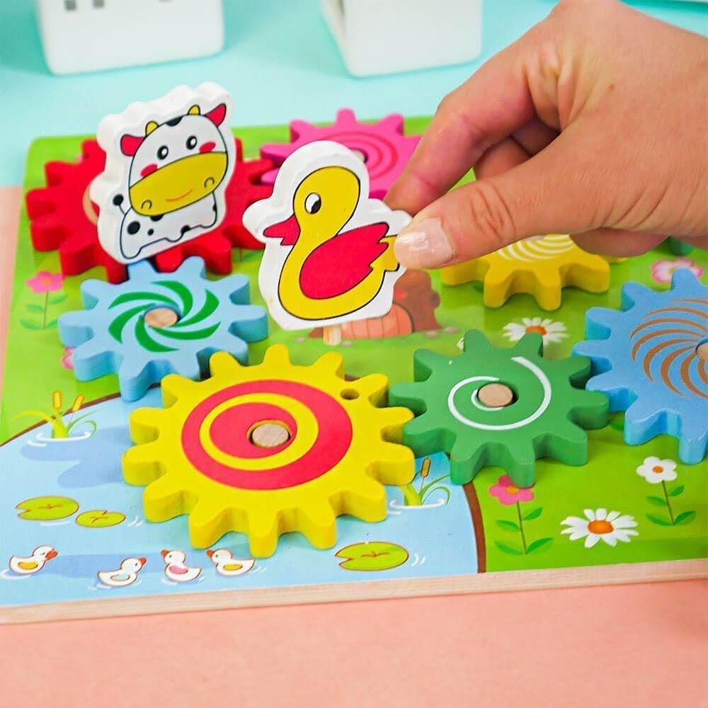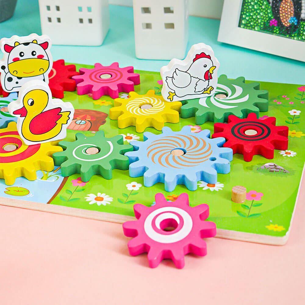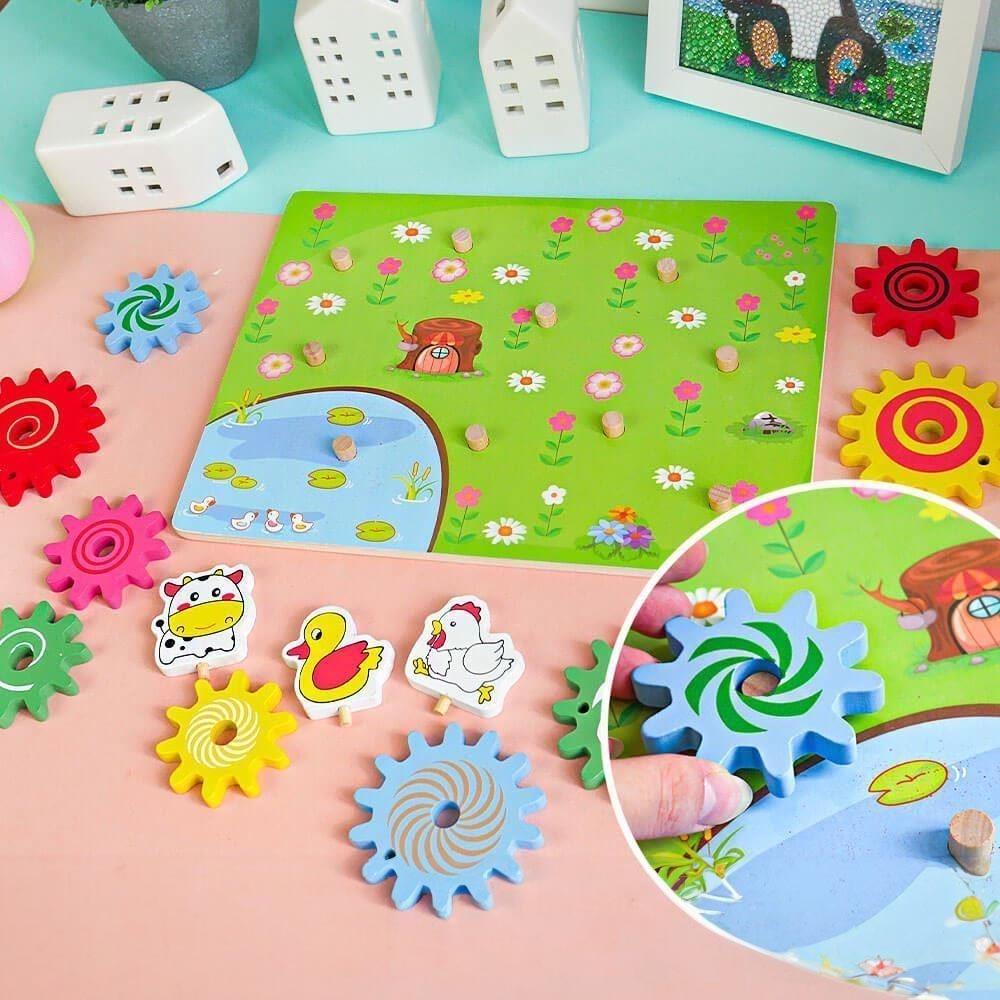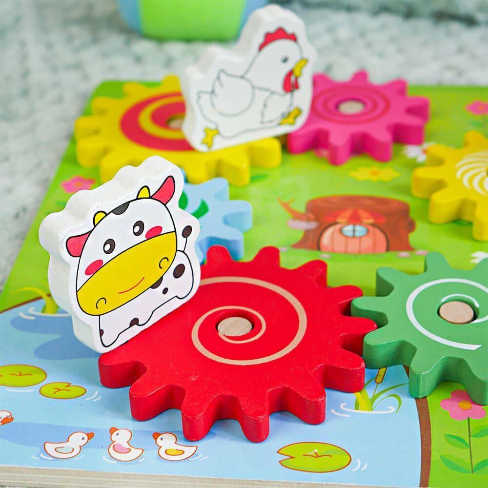 Jucărie din lemn cu rotițe dințate și animăluțe