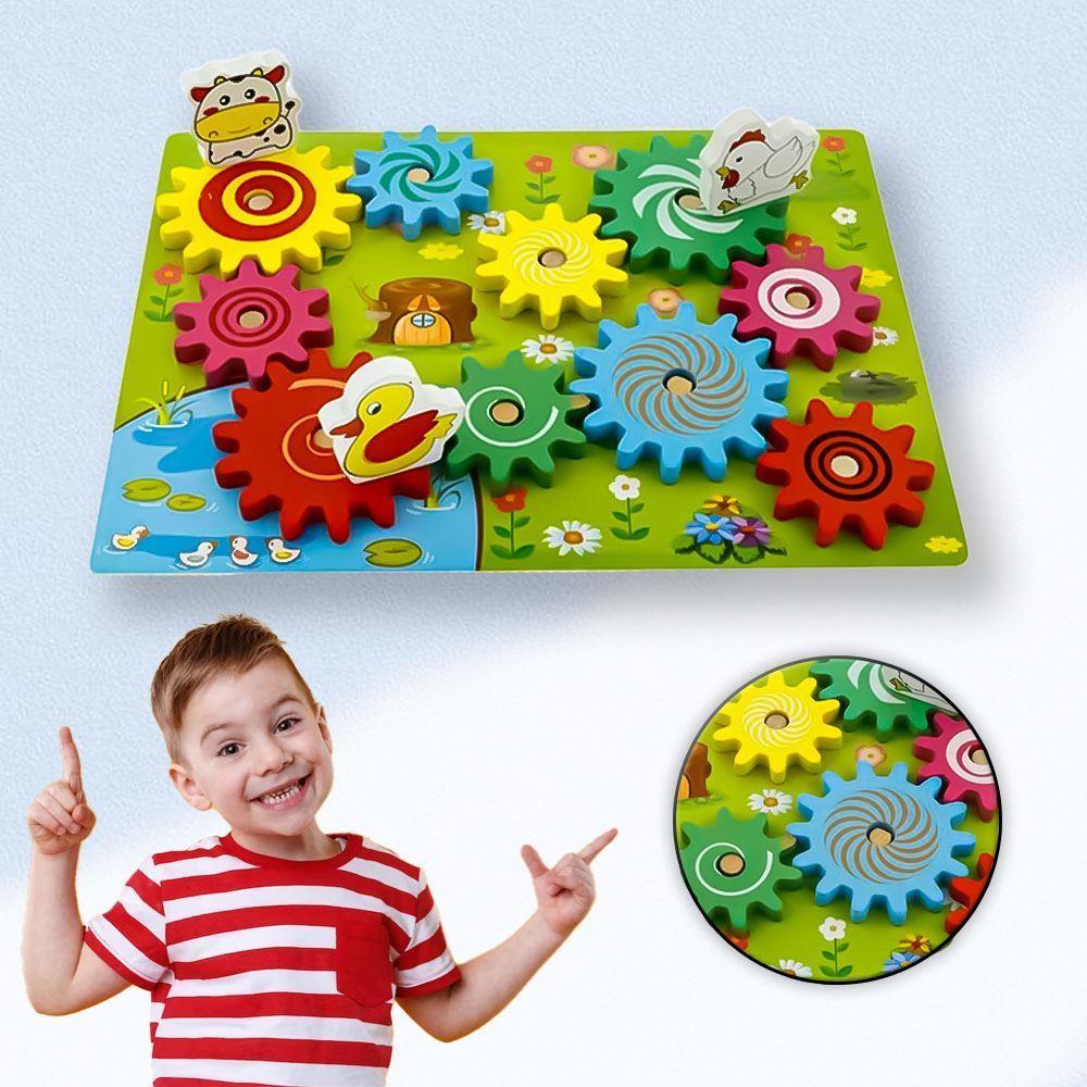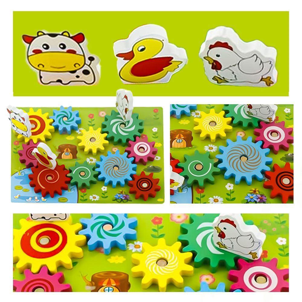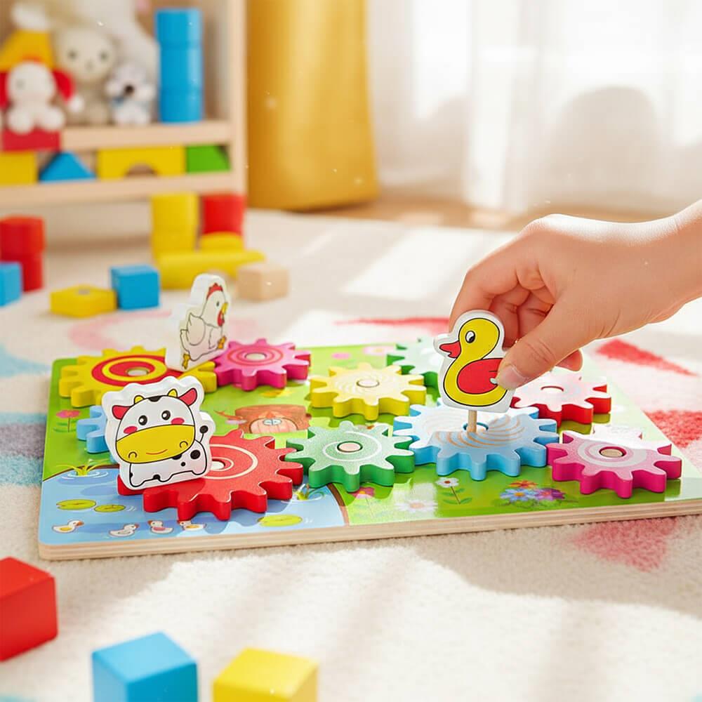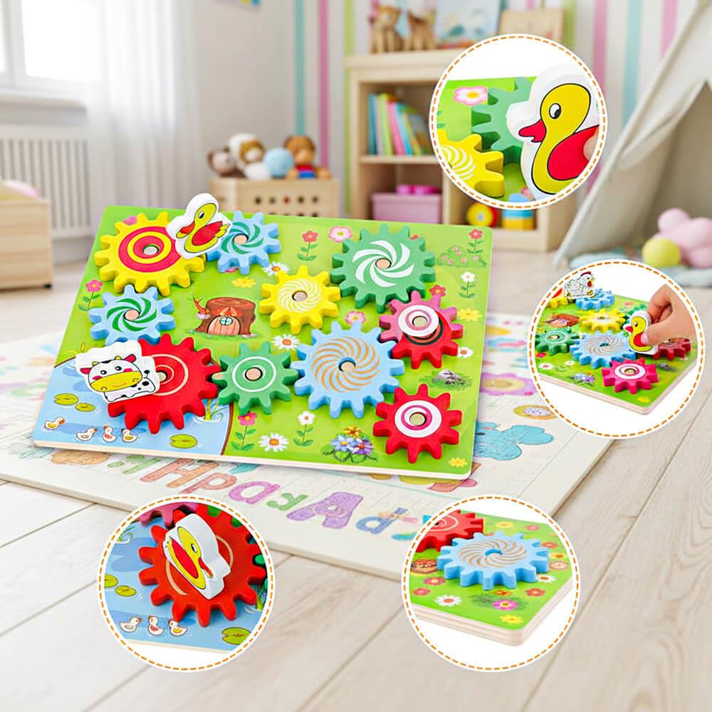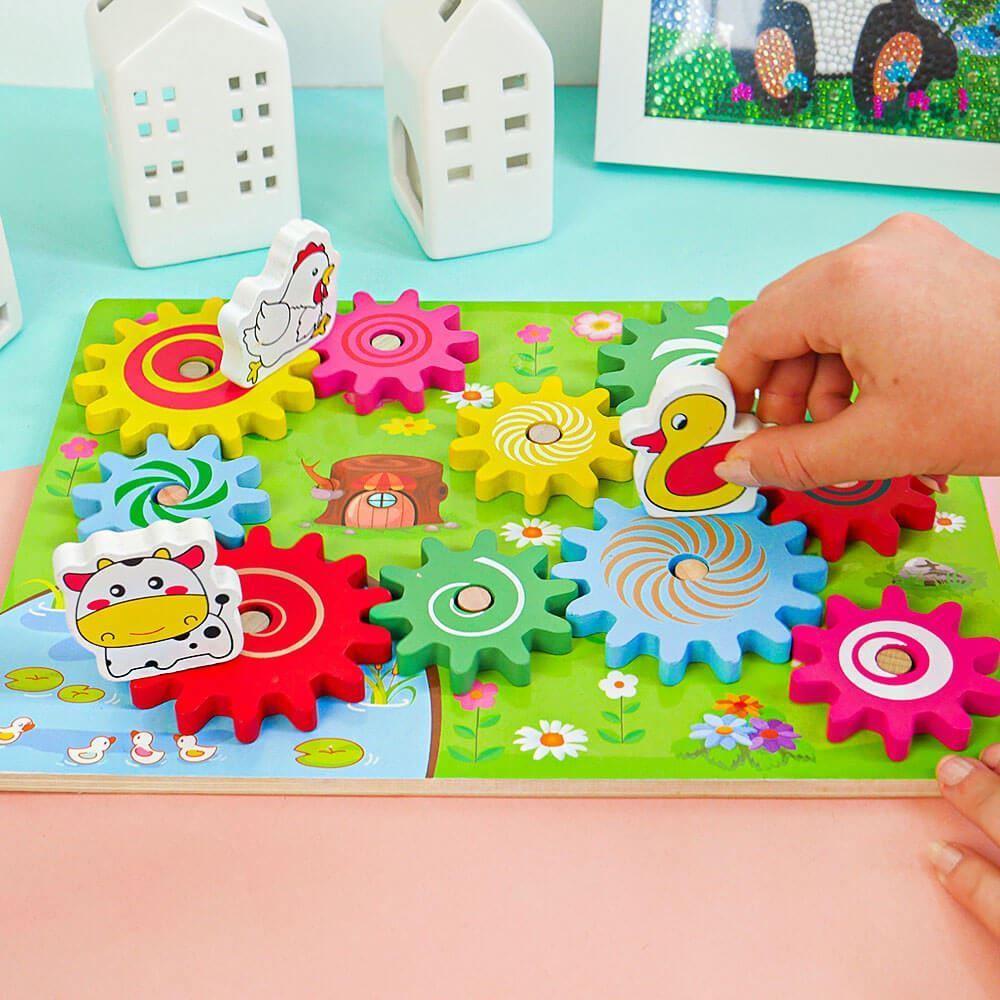 Jucărie din lemn cu rotițe dințate și animăluțe