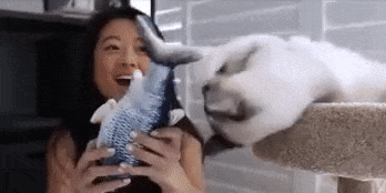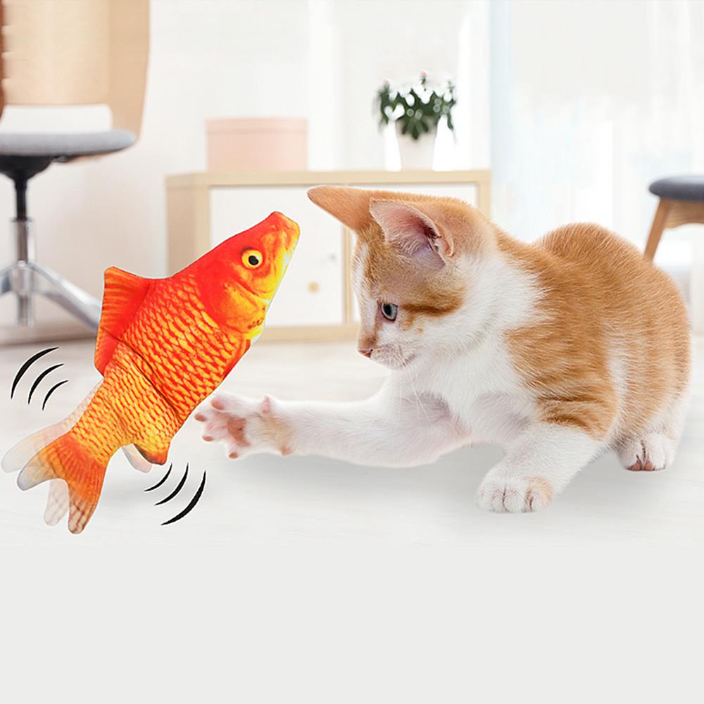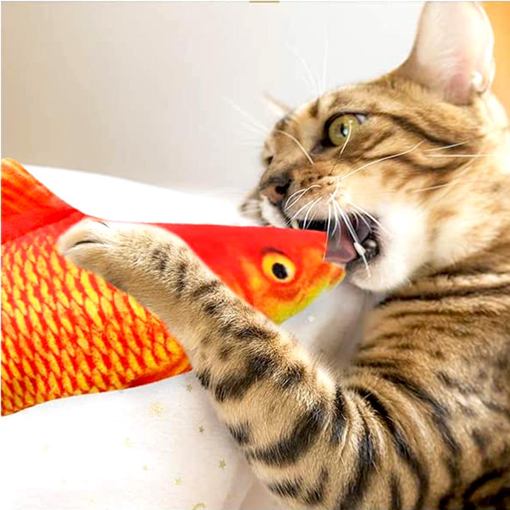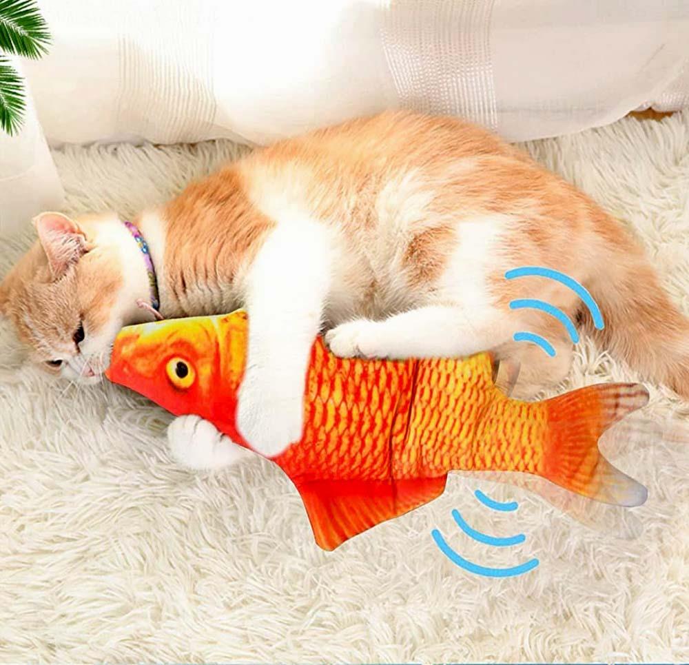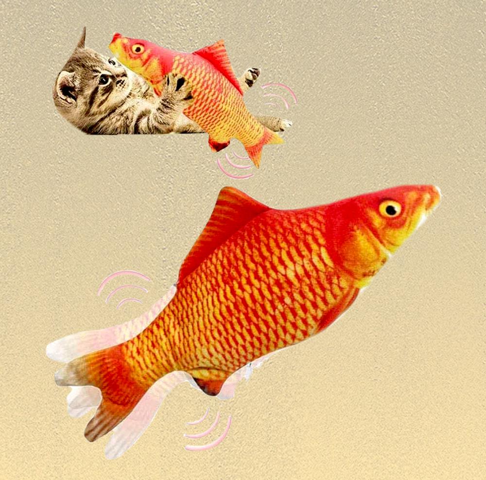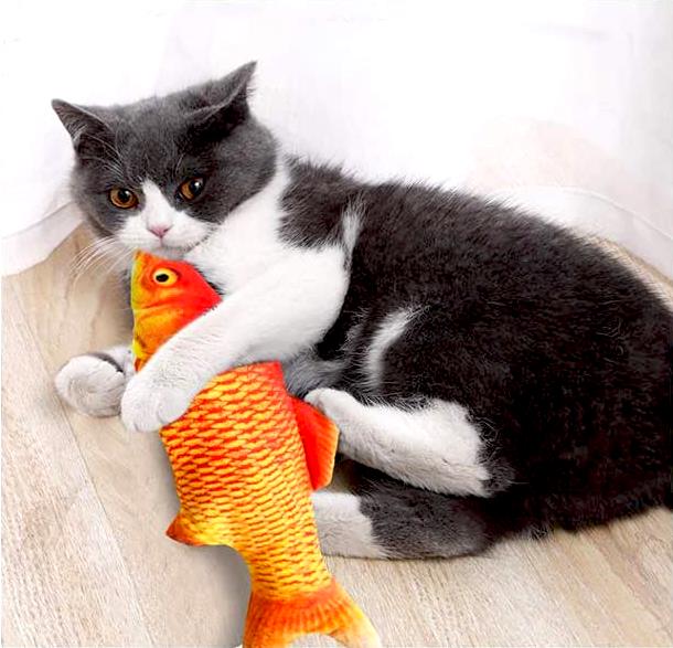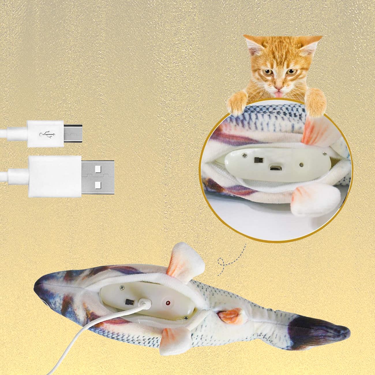 Pisicile se joacă sau se alintă cu peștele. La contact, peștele începe să se zbate, iar atunci când nu este folosit rămâne nemișcat. Se reîncarcă prin cablul USB inclus.