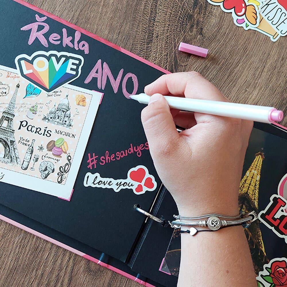Pachetul conține tot ce aveți nevoie pentru a personaliza jurnalul. Cu ajutorul colțurilor autoadezive, puteți lipi cu ușurință fotografii, cărți poștale, bilete de avion sau bilete de la locurile pe care le-ați vizitat împreună. În jurnal puteți, de asemenea, să scrieți, să desenați și să decorați paginile după bunul plac, folosind autocolantele drăguțe incluse.