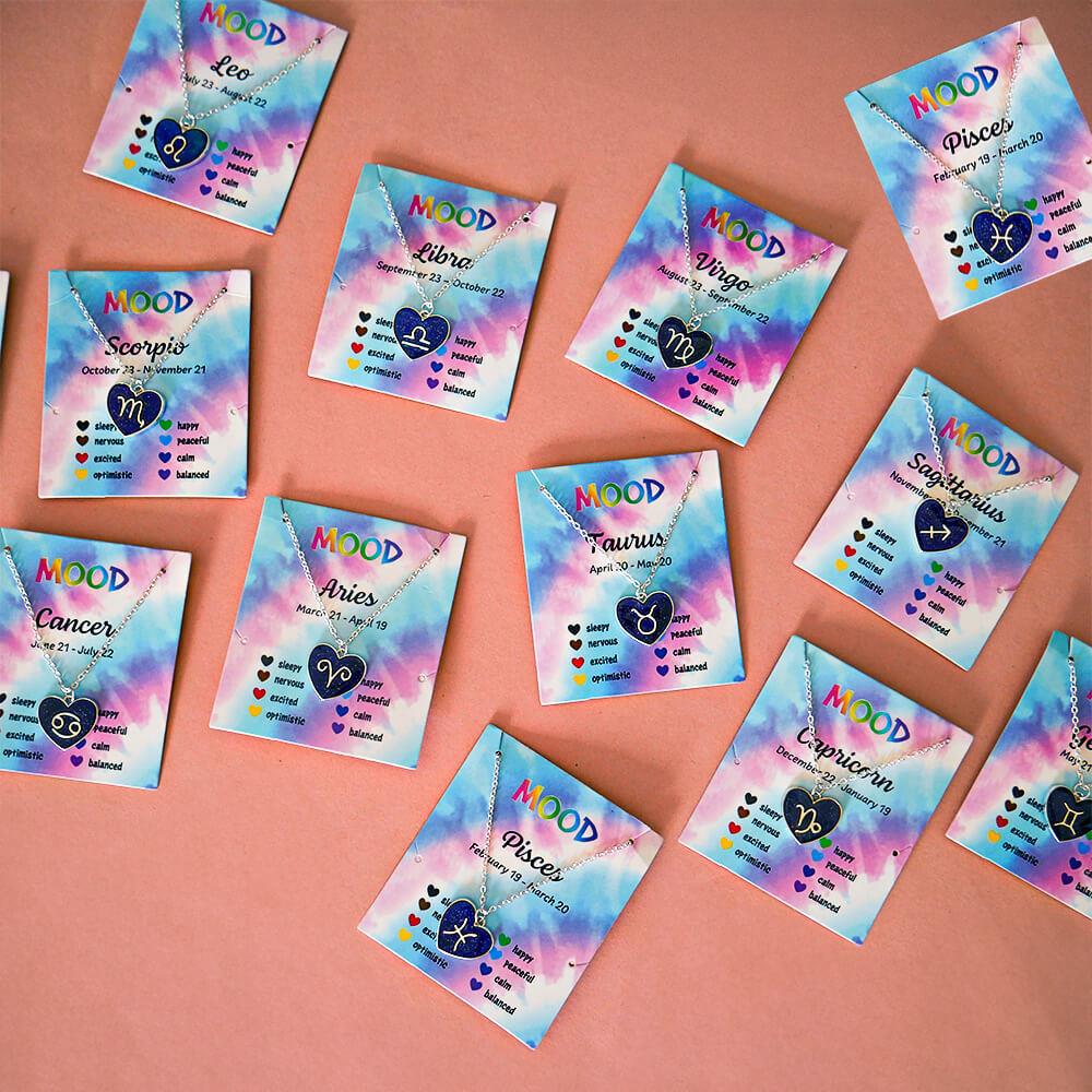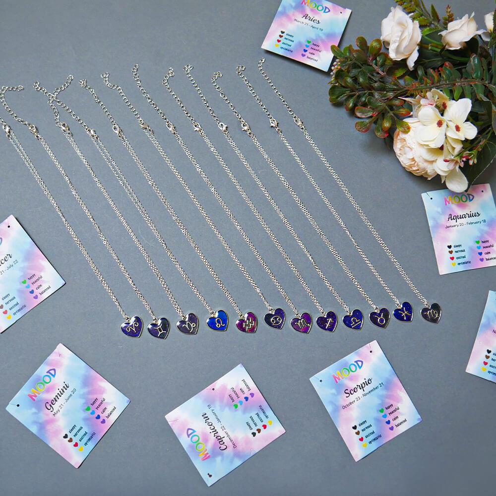 Lănțișorul cu emoții și semn zodiacal este o bijuterie originală ce îmbină frumusețea cu semnificația personală. Pandantivul își schimbă culoarea în funcție de temperatura corpului tău, reflectând astfel starea ta de spirit actuală. Culorile care apar pe lănțișor simbolizează diferite emoții, de la liniște la entuziasm, făcând această bijuterie unică.
