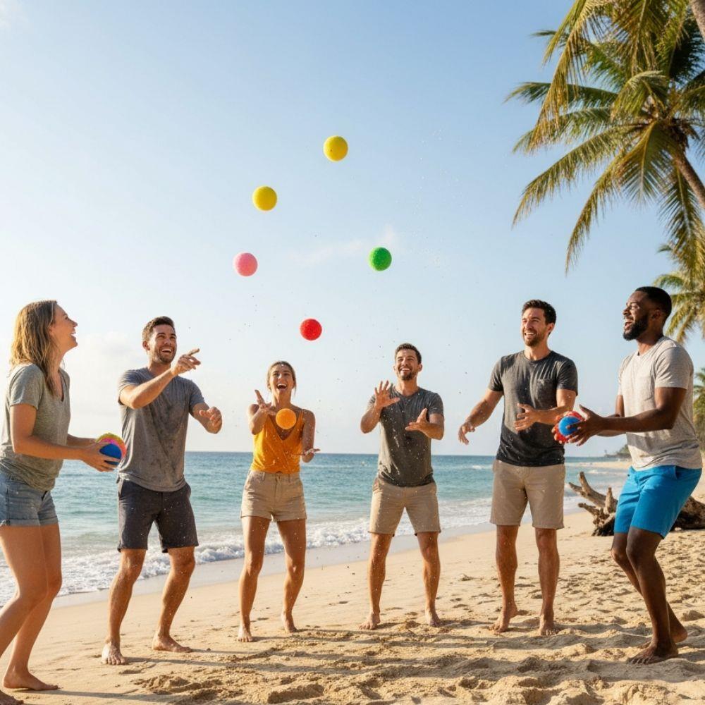 Pachetul conține 12 bile colorate cu diametrul de aproximativ 5 cm, astfel încât mai mulți jucători pot participa simultan la o bătălie cu apă. Datorită materialului moale, bilele sunt sigure pentru copii și suficient de ușoare pentru a putea fi aruncate ușor. Distracție ideală pentru grădină, lângă piscină, pe plajă sau la o petrecere de vară.
