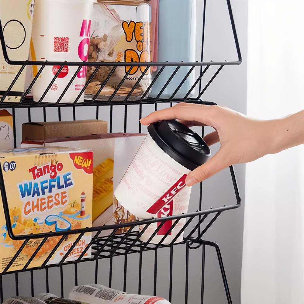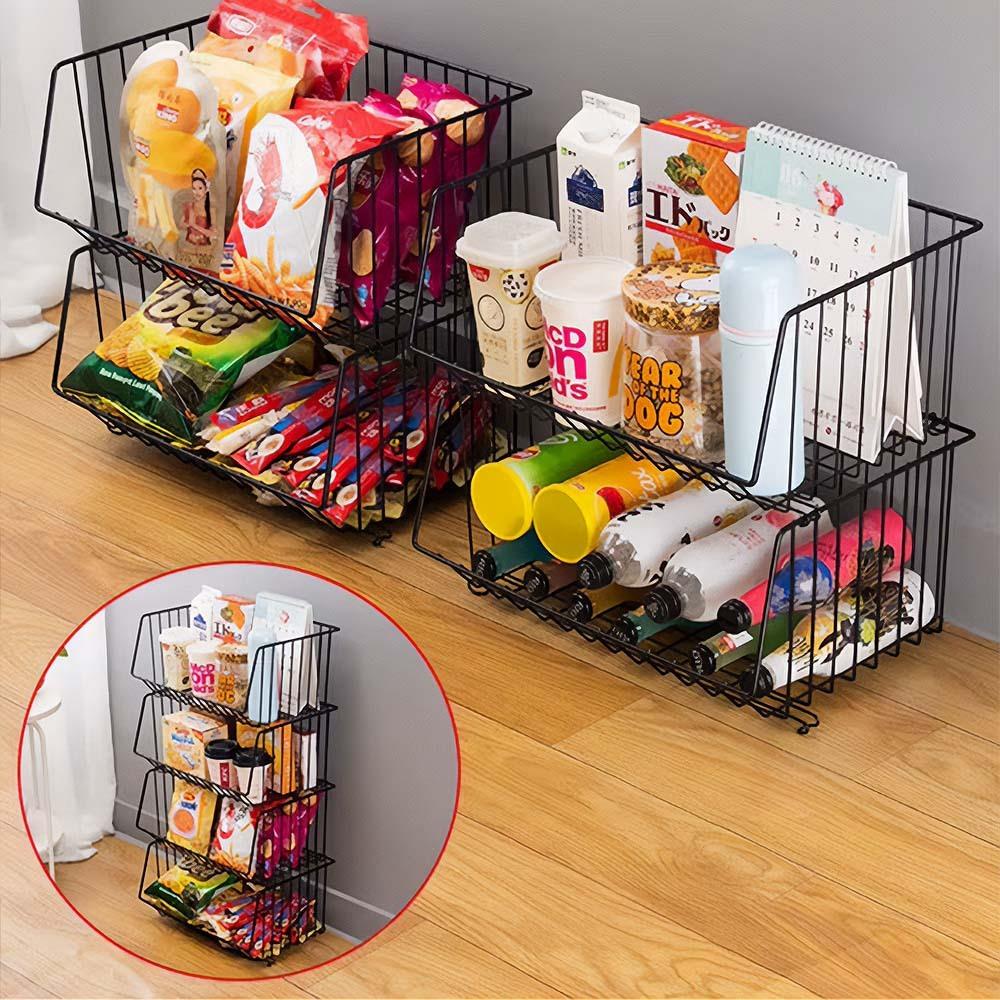Organizatorul metalic cu trei niveluri, stivuibil, este soluția ideală pentru toți cei care doresc să mențină ordinea în bucătărie, cămară, baie sau birou. Datorită dimensiunii sale, oferă suficient spațiu pentru depozitarea alimentelor ambalate, borcanelor, condimentelor, produselor de curățenie și a altor mărunțișuri.