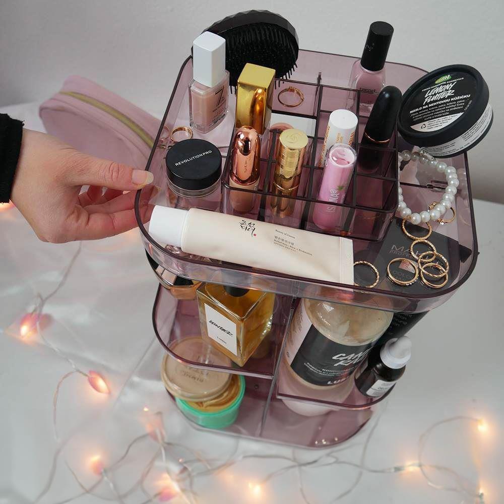 Fiecare pasionată de skincare știe că depozitarea produselor cosmetice poate fi uneori un adevărat coșmar. Sertarele se umplu, de pe rafturi mai cade câte o sticluță și tot te întrebi unde a dispărut crema folosită ieri? Previne produsele sparte și haosul – avem soluția pentru organizarea atât în baie, cât și pe măsuța ta de toaletă. Cu acest organizator rotativ poți spune adio dezordinii și te poți concentra în liniște pe răsfățul pielii tale.