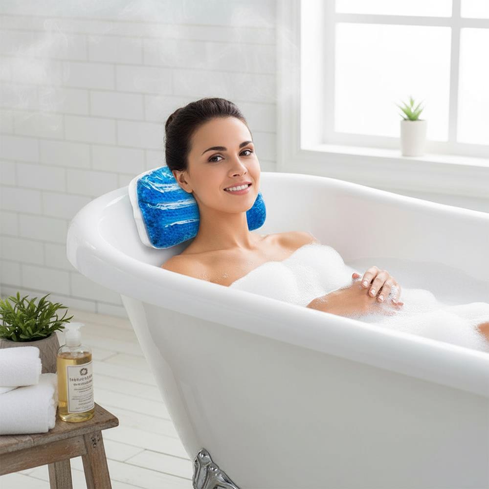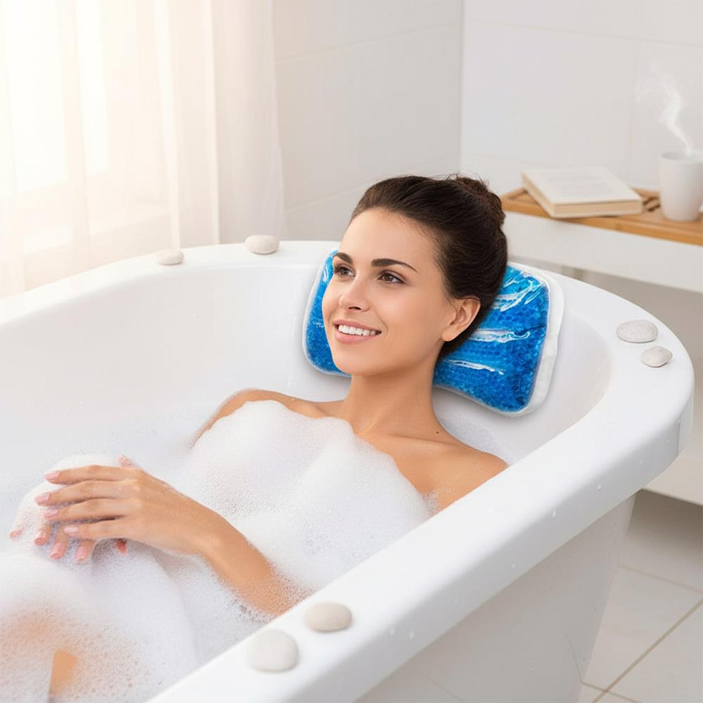 Apă fierbinte calmantă, spumă, lumânări, vin bun. De asemenea, nu poți să aștepți să te întinzi acasă în cadă? De data aceasta oferă-ți și mai mult confort cu o pernă specială pentru cadă. Perna este umplută cu bile de gel care asigură un sprijin confortabil pentru cap, gât sau spate. Astfel, nu există riscul să te doară gâtul din cauza căzii.