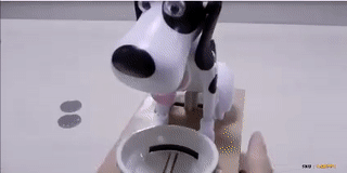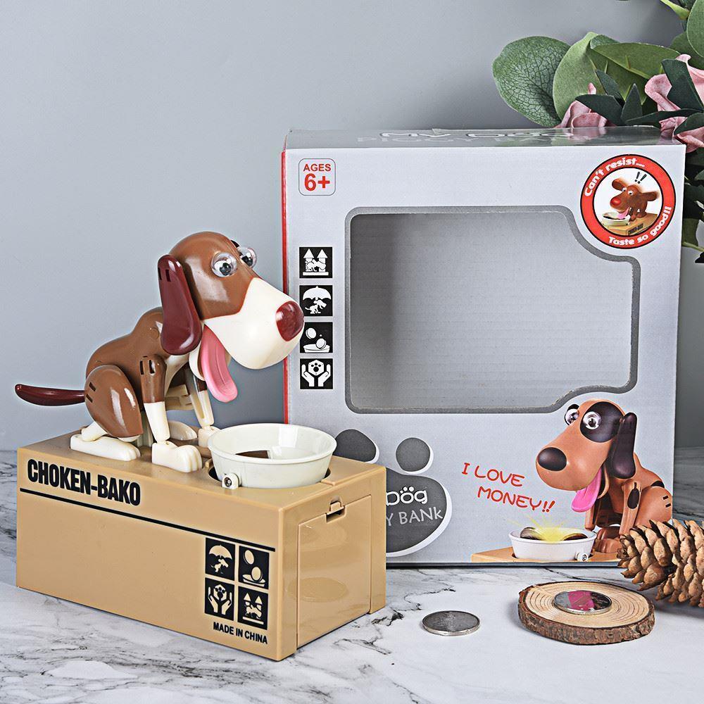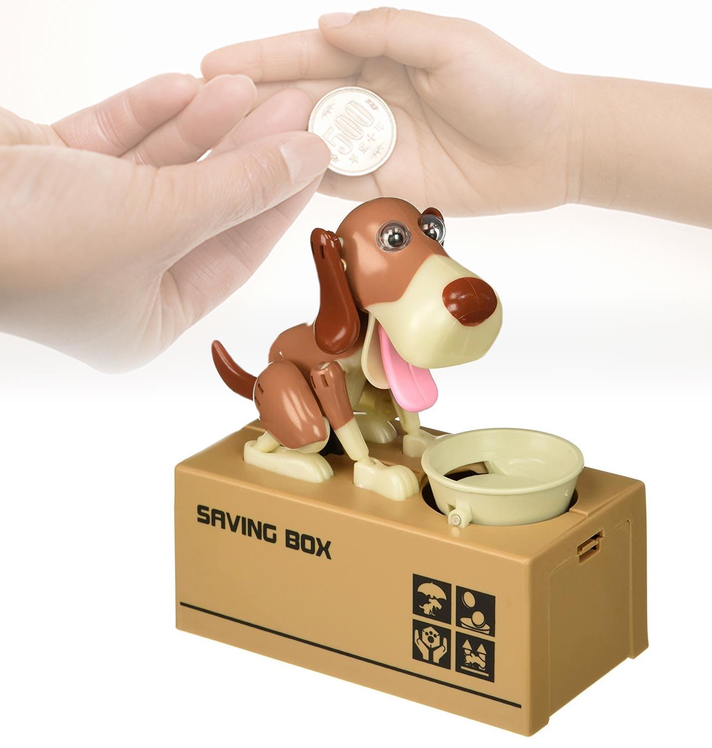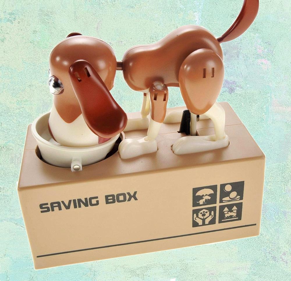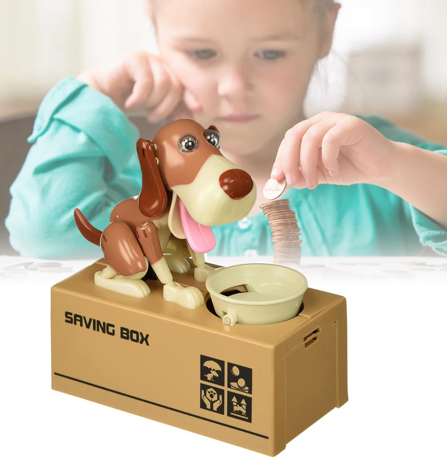 O pușculiță adorabilă în formă de cățeluș mereu înfometat. Va fi un succes total la copii! Cățelușul este mereu flămând, dar dacă credeți că îl veți convinge cu granule, nici vorbă! Dacă nu credeți, puneți o monedă în bolul lui și convingeți-vă singuri. Cățelușul prinde viață imediat și înghite moneda introdusă înainte să vă dați seama. Și ce se întâmplă cu monedele după aceea? O ușiță aflată în partea din față a pușculiței vă va da răspunsul.