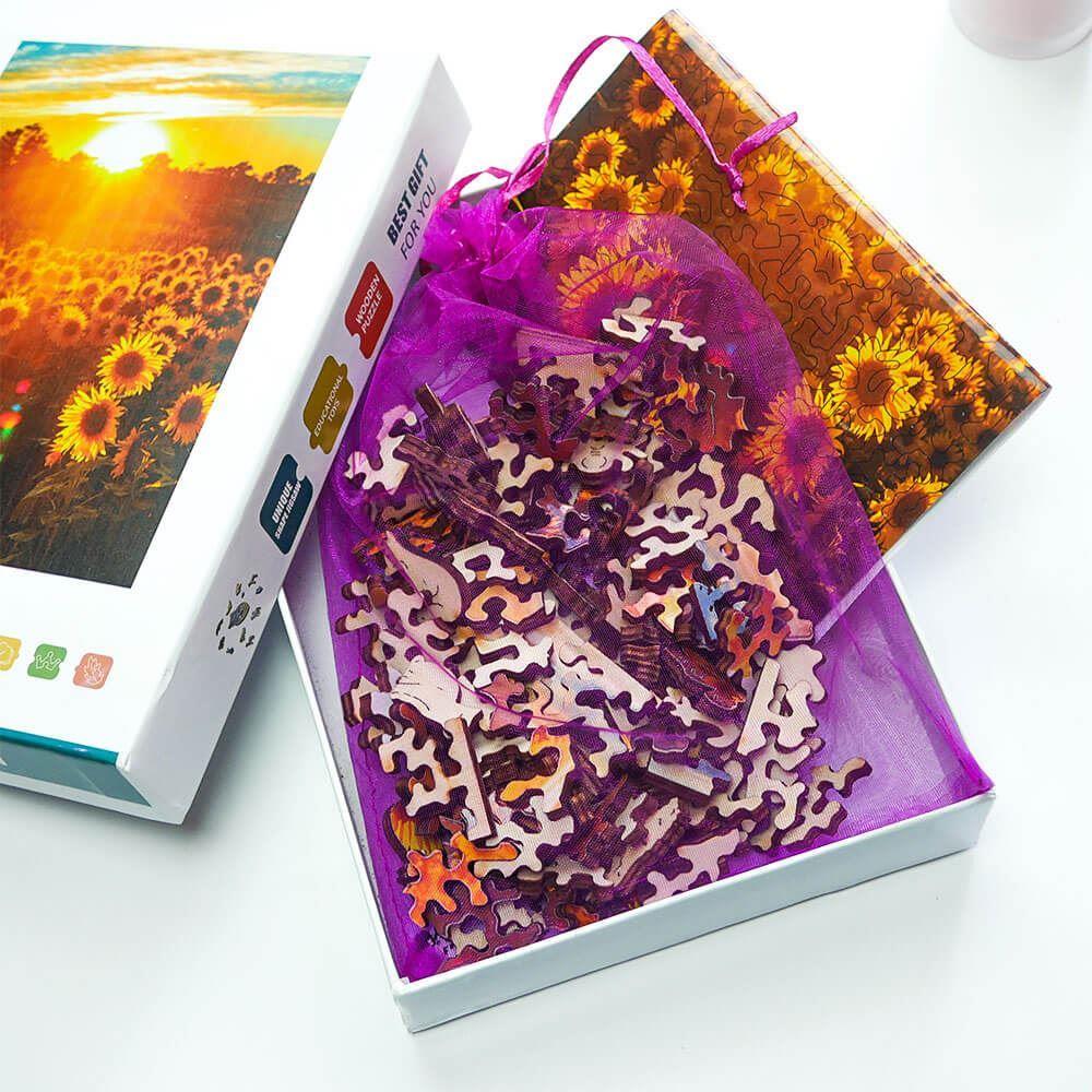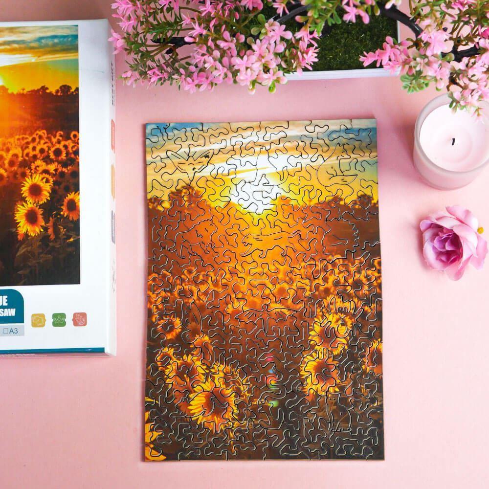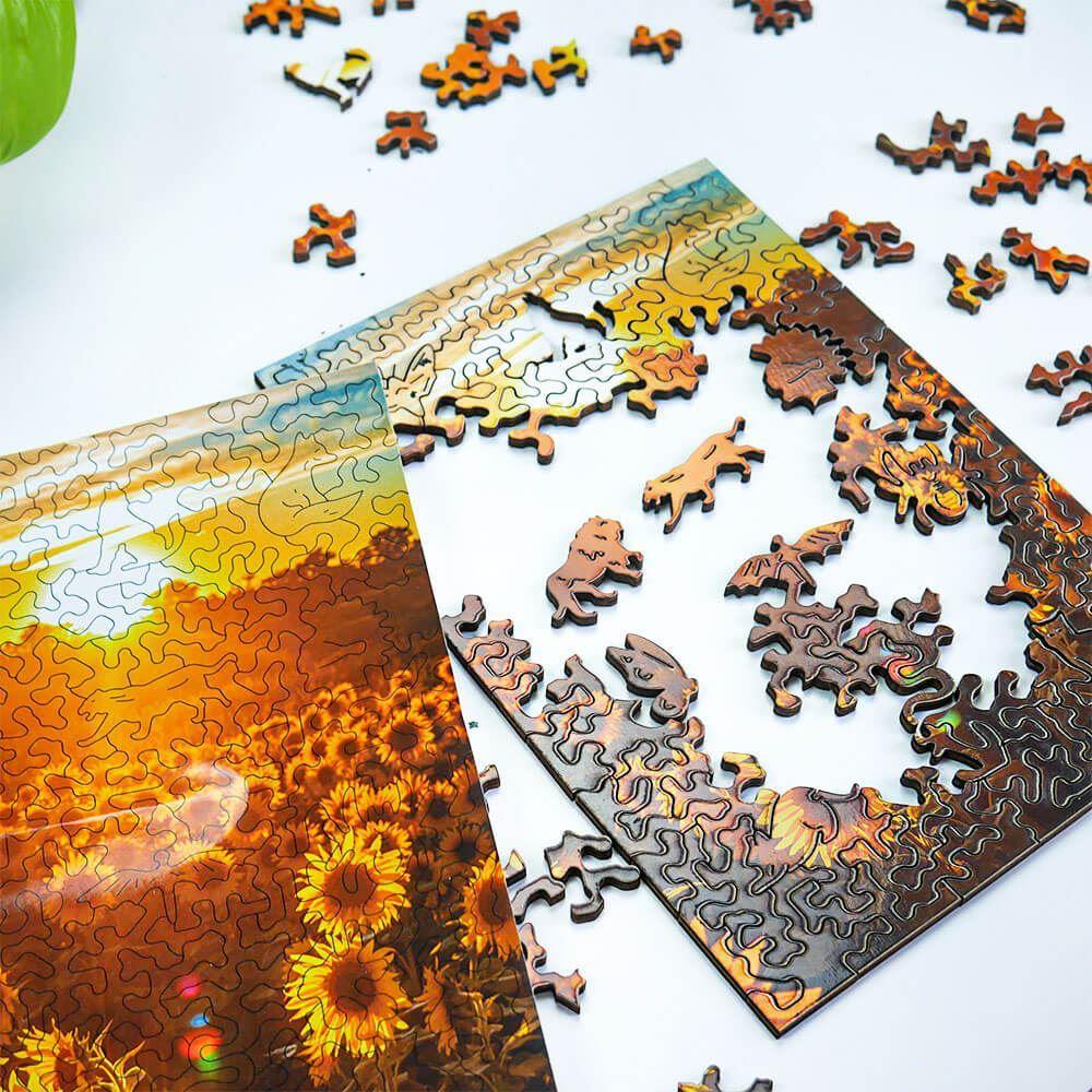 Scufundați-vă în farmecul unui câmp de floarea-soarelui înflorit cu puzzle-urile noastre din lemn