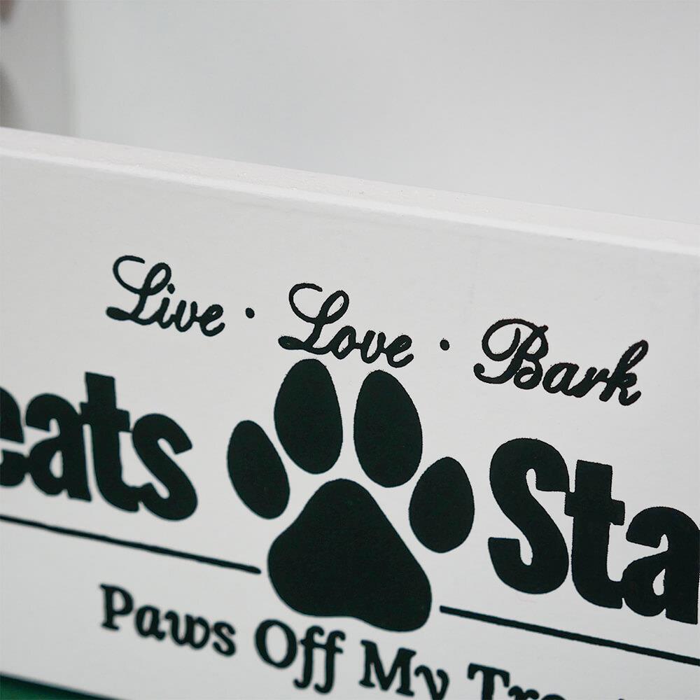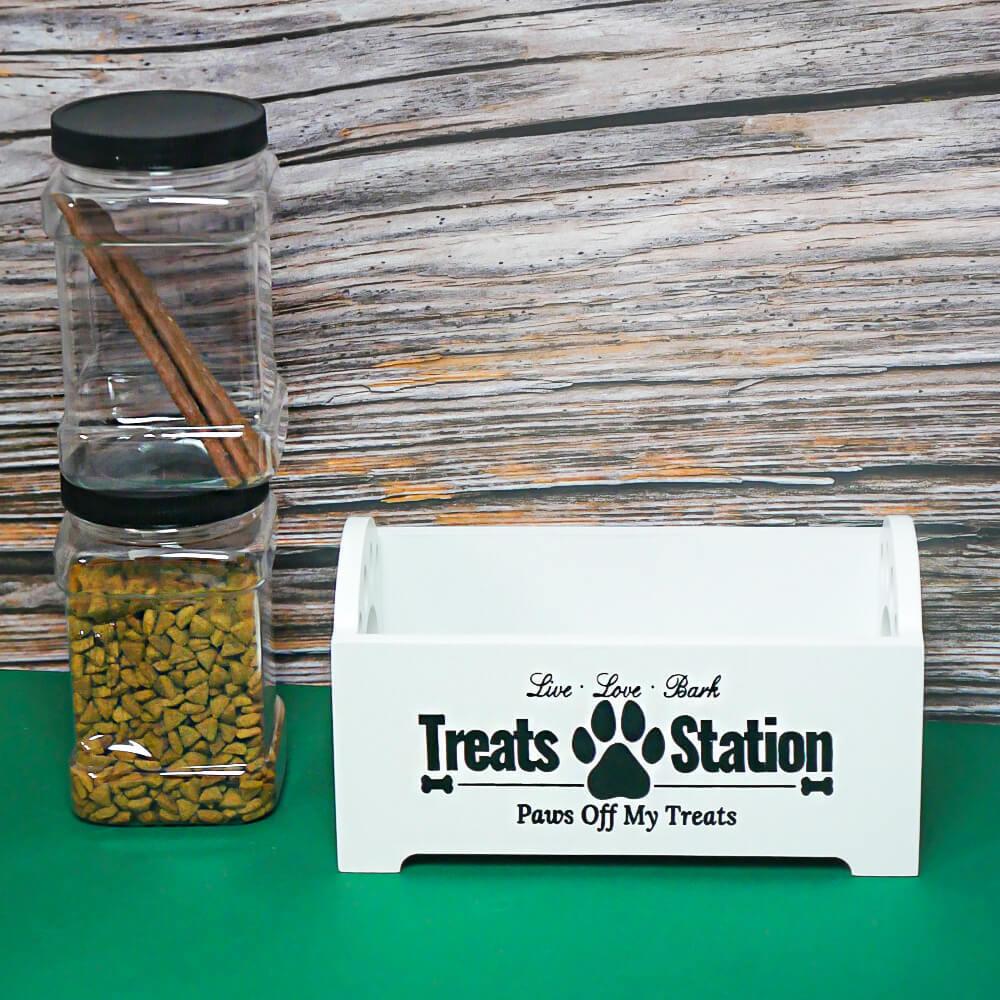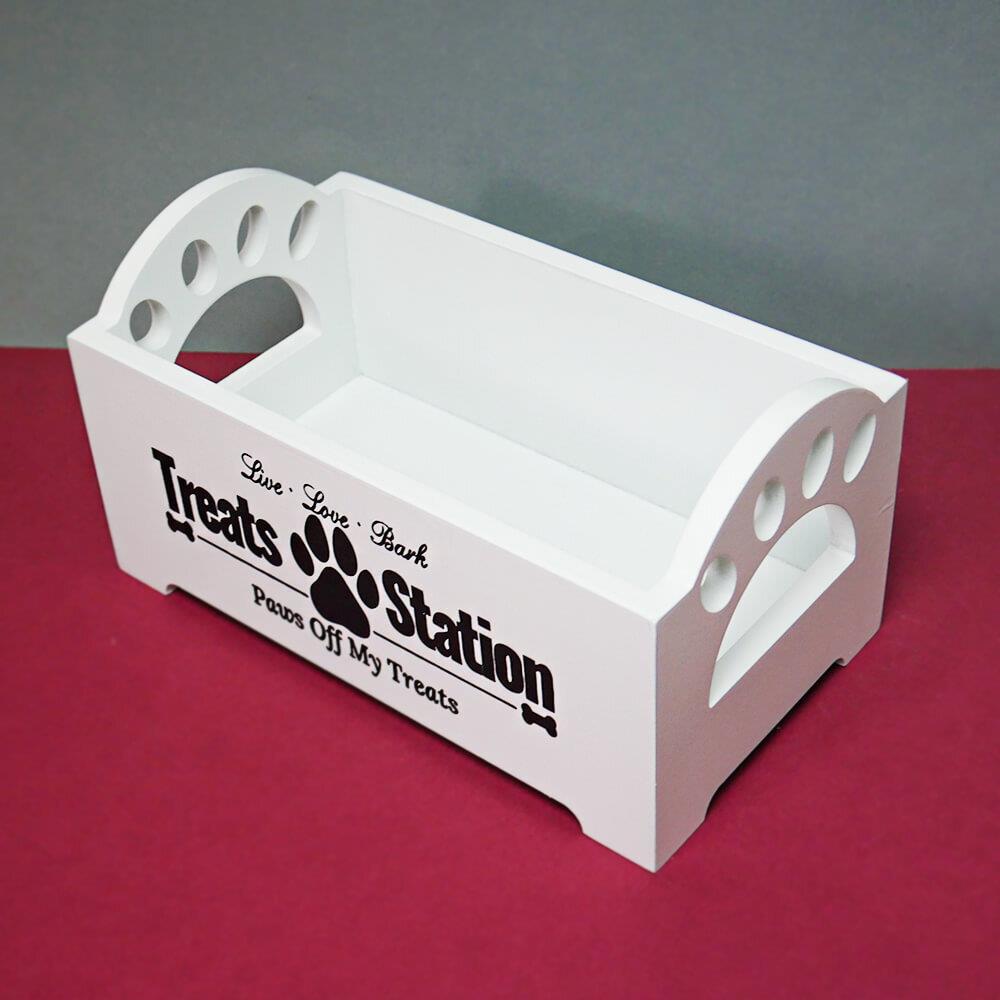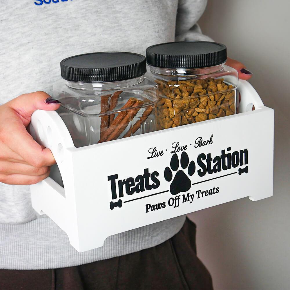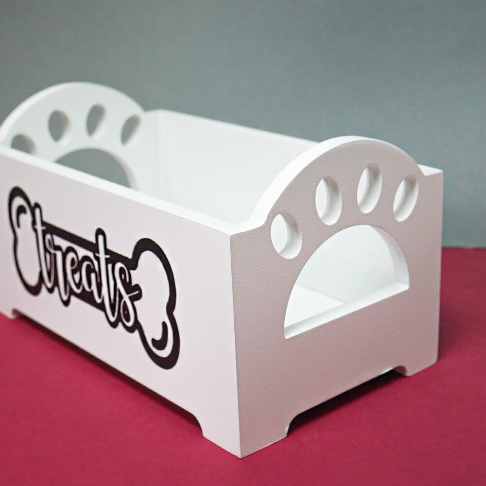 Organizatorul din lemn, de culoare albă, păstrează ambele recipiente la locul lor și arată minunat în orice interior. Datorită orificiilor practice din lateral, îl puteți muta cu ușurință în orice loc. Este potrivit pentru bucătărie, hol sau pe un raft cu produse pentru animale de companie. Este un accesoriu inteligent pe care îl va aprecia fiecare câine și stăpânul său.