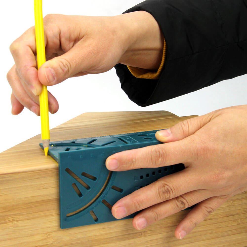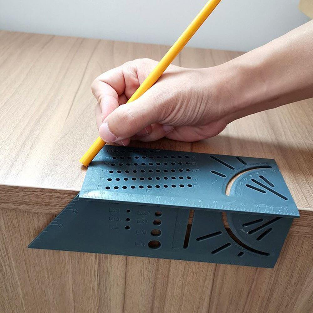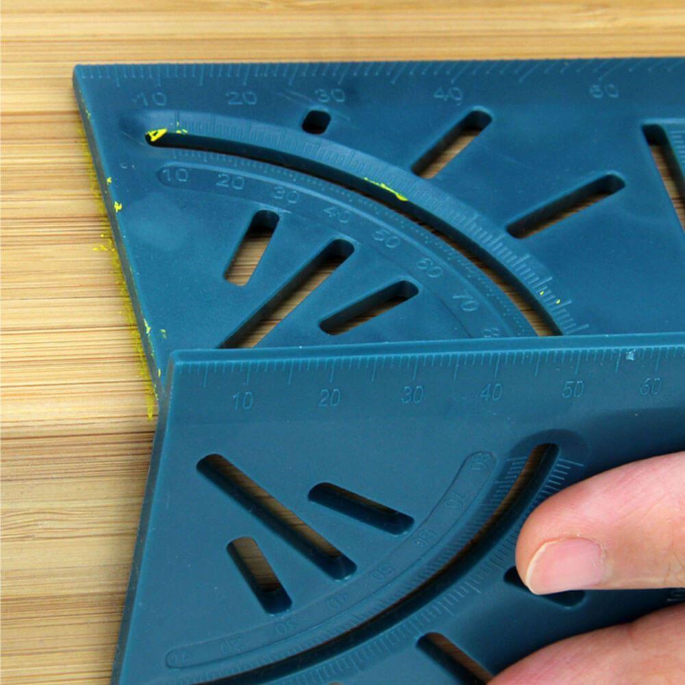 Cum se folosește rigla? Așază rigla pe muchie și folosește una dintre funcțiile sale, precum raportorul, rigla, orificiile pentru măsurarea rapidă a diametrului burghiului sau găurile pentru trasarea simplă a liniilor paralele cu muchia. Dacă folosești orificiile pentru desenarea liniilor paralele, introdu vârful creionului în orificiul corespunzător și glisează întreaga riglă. Valorile inscripționate pe partea cu vârful corespund unghiurilor. La nevoie, șterge cu o cârpă umedă.