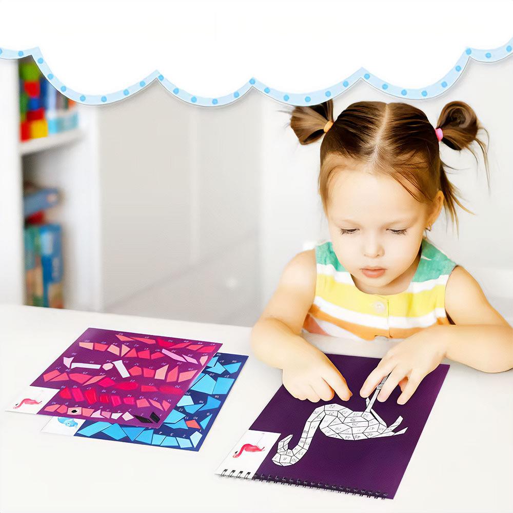Setul creativ de lipire după numere este o activitate grozavă pentru copiii care adoră să creeze. Caietul conține 7 imagini frumoase, pe care copiii le completează treptat cu autocolantele potrivite conform numerelor. Fiecare formă are propriul număr, iar copilul găsește cu ușurință locul corect – rezultatul este o imagine mozaicată deosebită.
