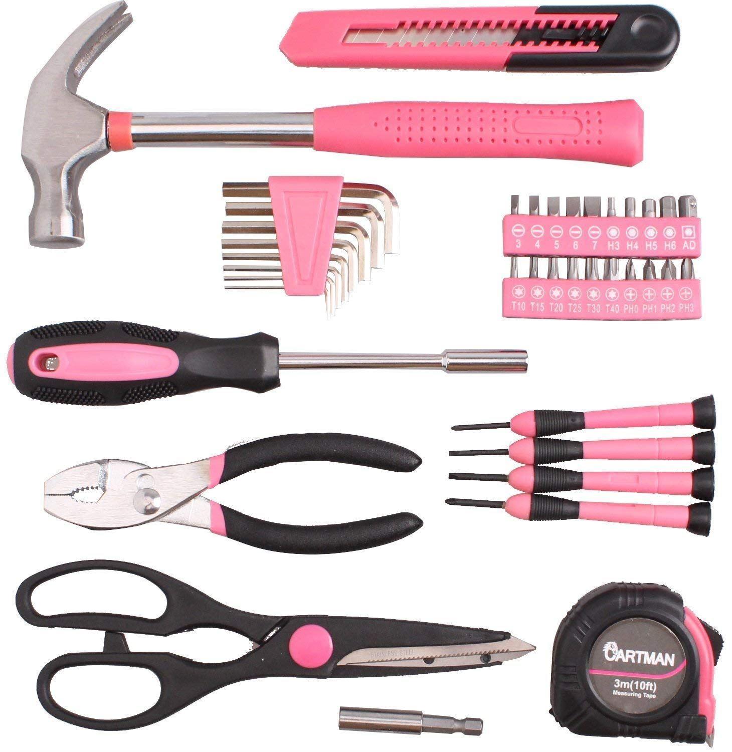 În setul de unelte pentru femei veți găsi: foarfecă, ciocan, cuțit, diverse tipuri de șurubelnițe, clește etc. Toate sunt fabricate din oțel rezistent (crom-vanadiu) și ambalate într-o elegantă servietă neagră cu detalii roz. Un cadou original, practic și foarte util pentru toate femeile pricepute în bricolaj care doresc să fie independente acasă.