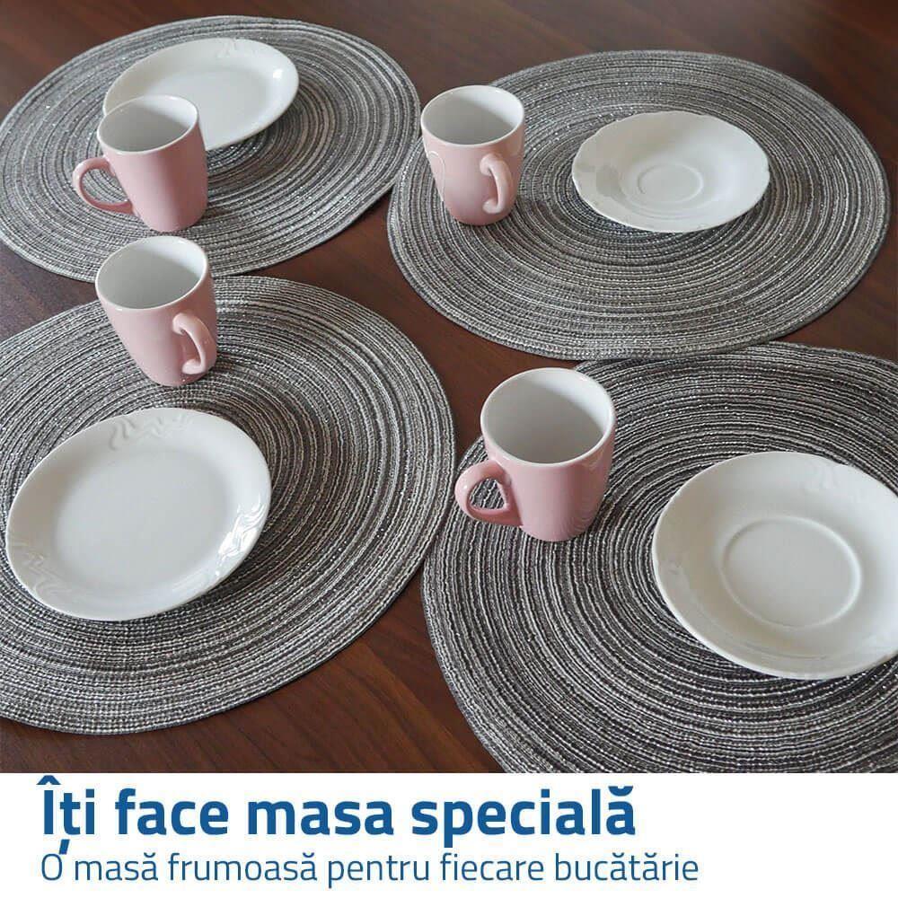 Oferă mesei tale de sufragerie o notă de gust cu ajutorul nostru rotund. Fața de masă se potrivește perfect în toate interioarele și va oferi mesei tale un aspect proaspăt și modern. Puteți aranja farfurii, castroane și tacâmuri pe fața de masă rotundă. Setarea mesei rotunde este potrivită pentru orice ocazie, de la cine de zi cu zi în familie până la întâlniri formale cu prietenii.