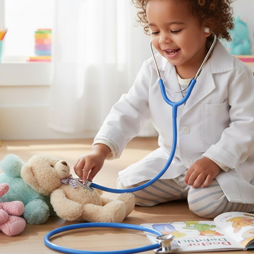 Are copilul dumneavoastră o frică inexplicabilă de vizita la doctor? Cu ajutorul jocului cu stetoscopul, îi puteți arăta că nu este deloc dificil și că poate fi chiar distractiv. Explicați, de exemplu, cum este posibil ca doctorul să audă inima sau plămânii, chiar dacă sunt ascunse în corp. Așadar, o respirație adâncă și o expirație... știți cum este! :)