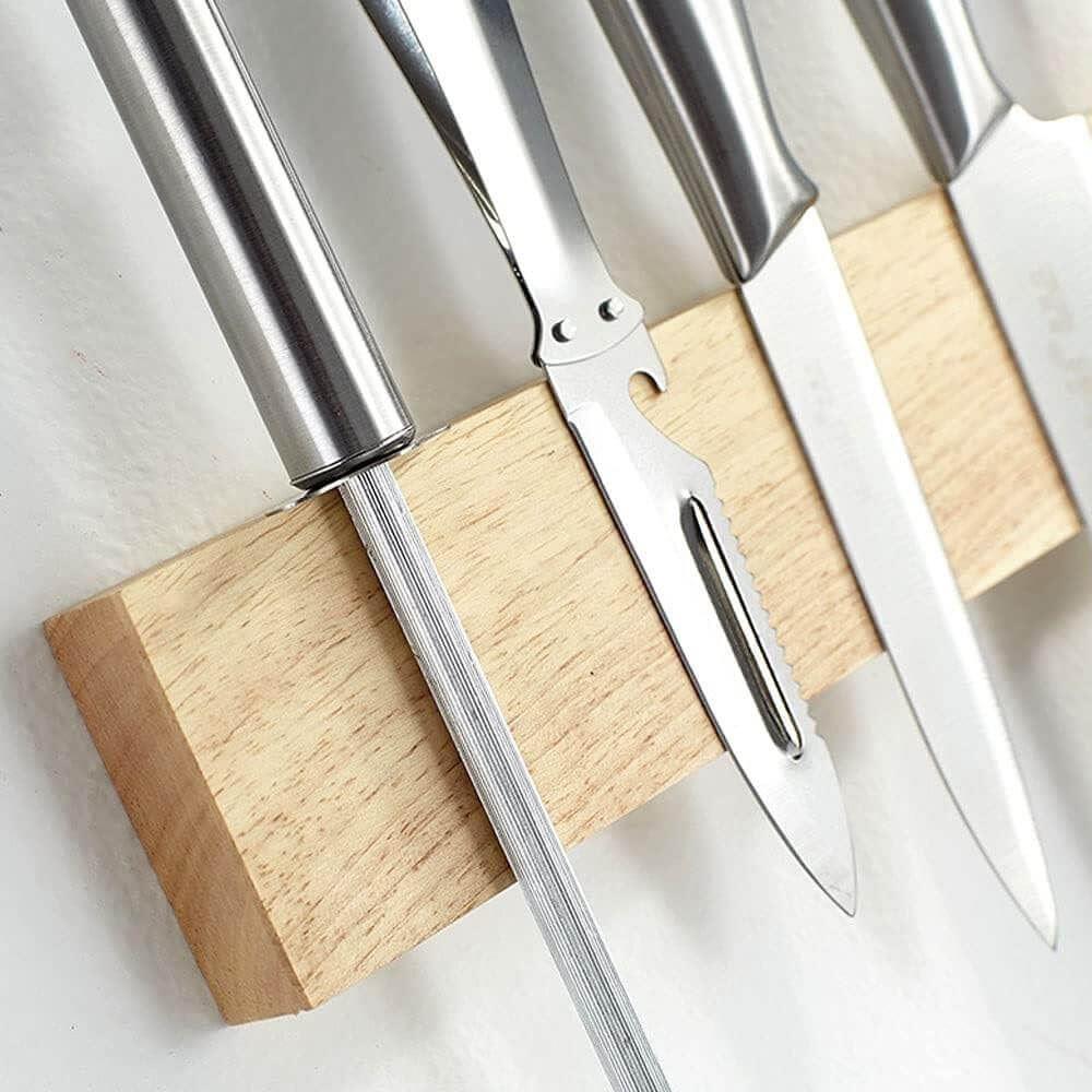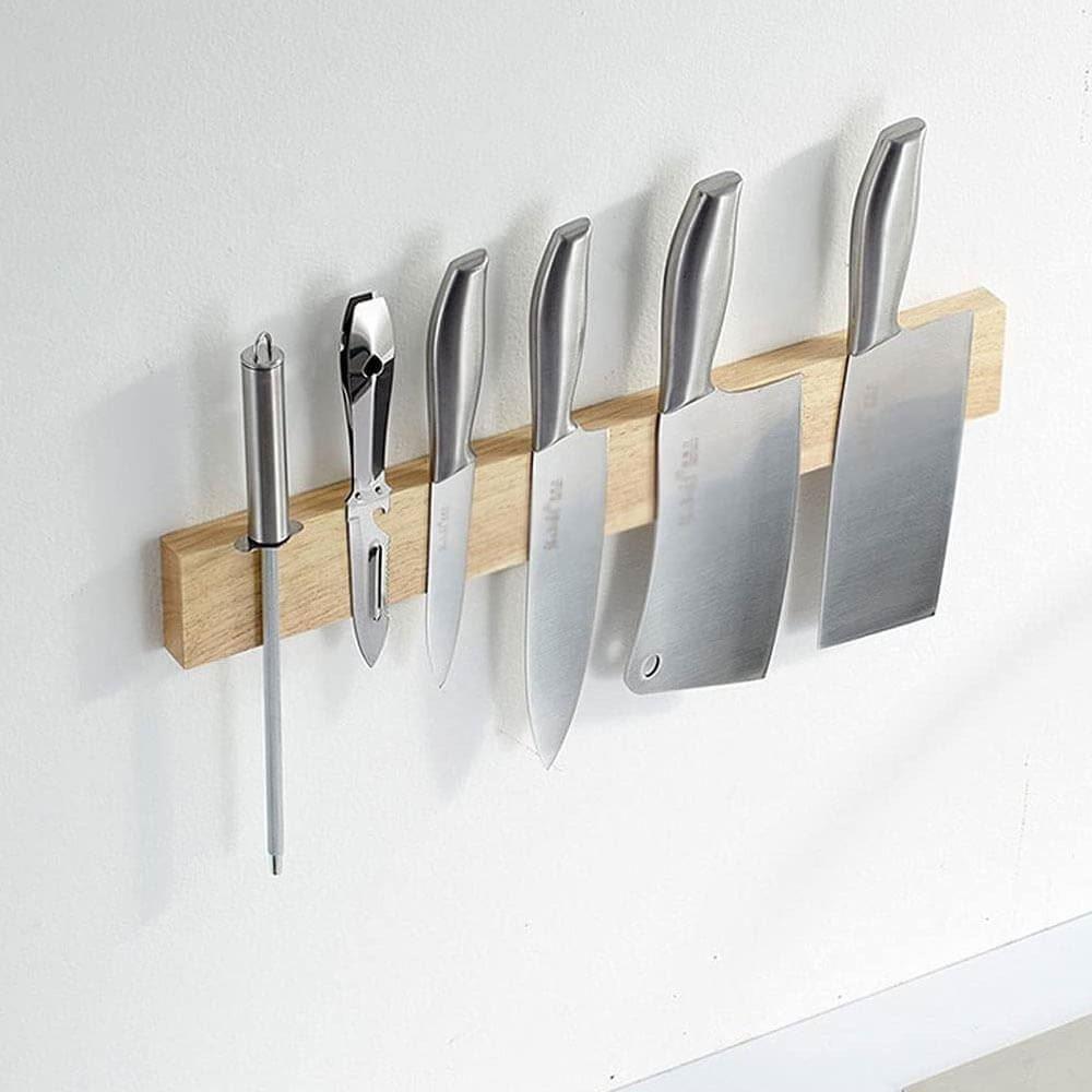 Suportul cu design imitație lemn completează perfect orice bucătărie modernă. Datorită magnetului puternic din interior, poate fi folosit pentru fixarea cuțitelor, satârelor, foarfecelor, dar și a spatulelor sau altor ustensile metalice.