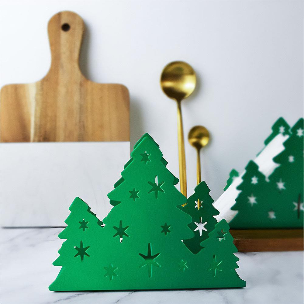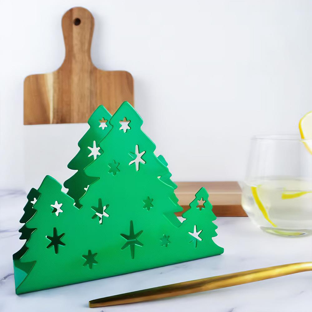 Suportul de șervețele în formă de brad de Crăciun este un accesoriu practic și decorativ pentru orice masă festivă. Este realizat din metal, care asigură stabilitate și durată lungă de viață, iar suprafața sa este ușor de curățat.