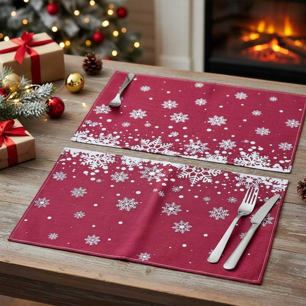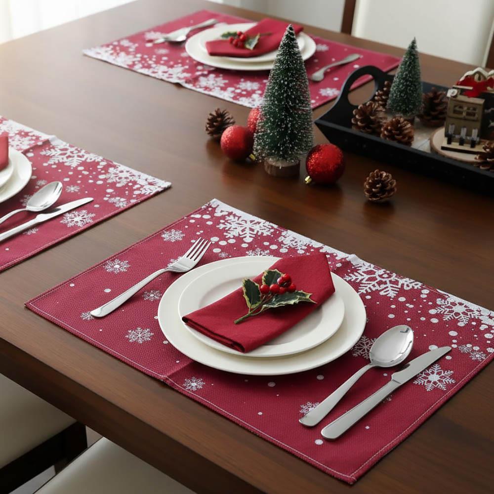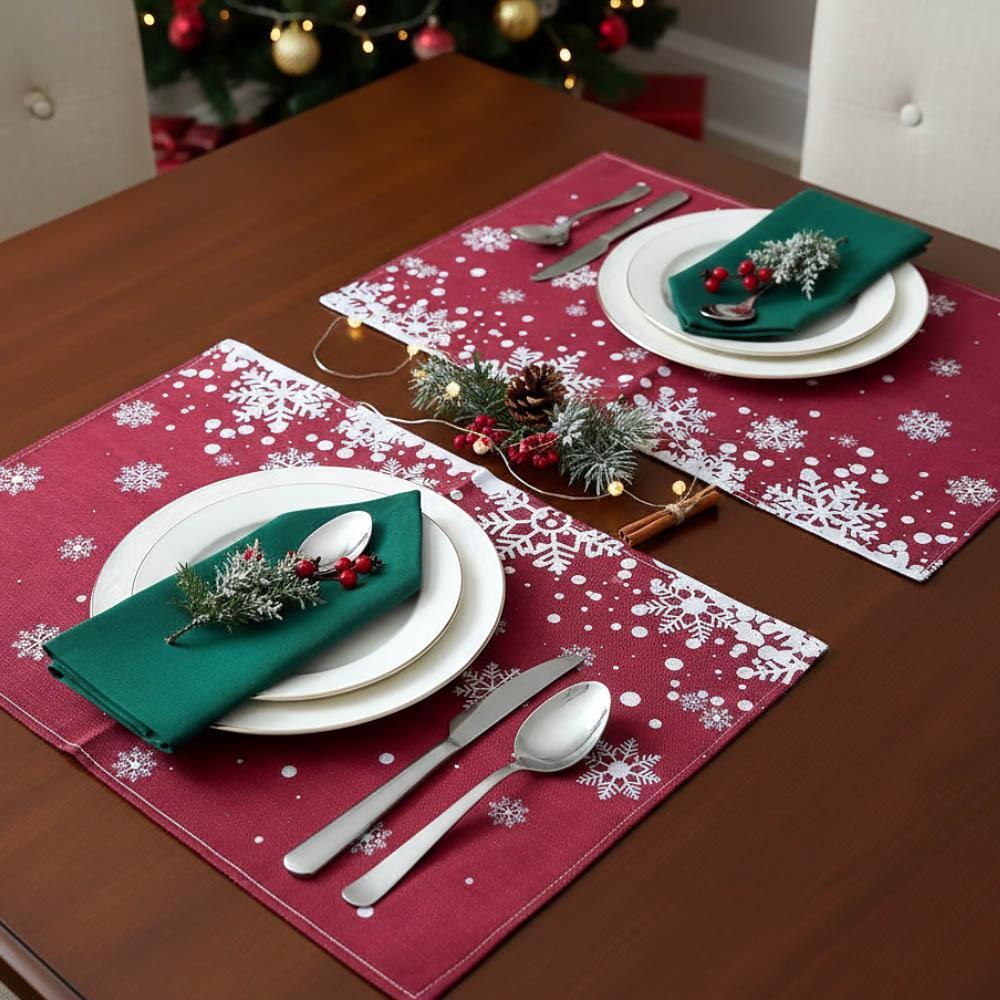 De Crăciun, ne decorăm casa nu doar cu un brad, ci și cu tot felul de decorații și luminițe. Lipim pe ferestre diverse motive de iarnă și Crăciun, plasăm statui și sfeșnice, și nu trebuie să uităm de masa noastră de dining, care ar trebui să arate elegant nu doar la cina de Ajun! Cu aceste suporturi de masă cu motiv de fulgi, îți poți împodobi mesele imediat ce iarna începe oficial în calendar! Fulgi magici pe un fundal roșu se vor încadra în orice locuință și vor completa perfect chiar și decorurile mai opulente.