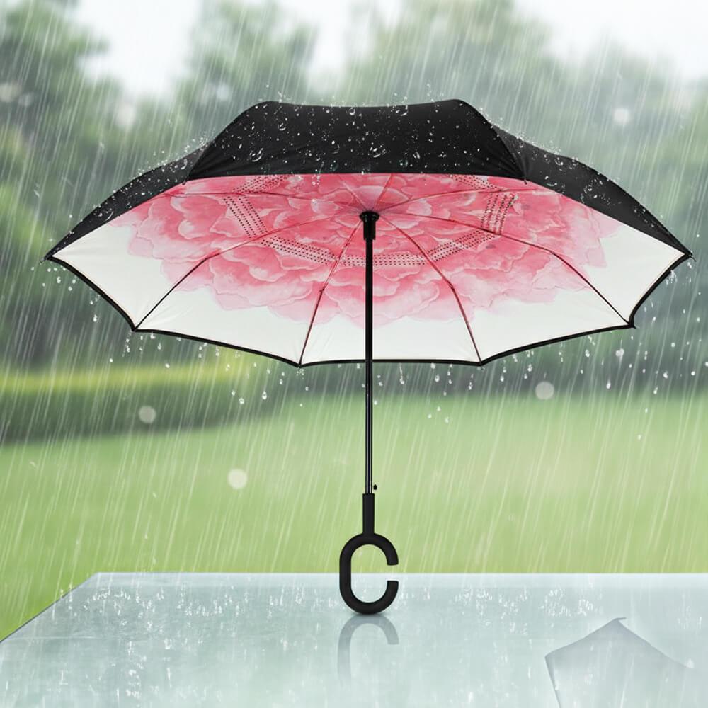 Probabil cel mai mare avantaj este faptul că datorită sistemului său invers de deschidere și închidere, toată apa rămâne în interior, astfel nu vă amenință să vă stropiți cu apă. Cu siguranță cunoașteți situația când ați pus o umbrelă udă pe scaunul din mașină și v-au fost ude documentele importante. Cu această umbrelă nu vi se va mai întâmpla!