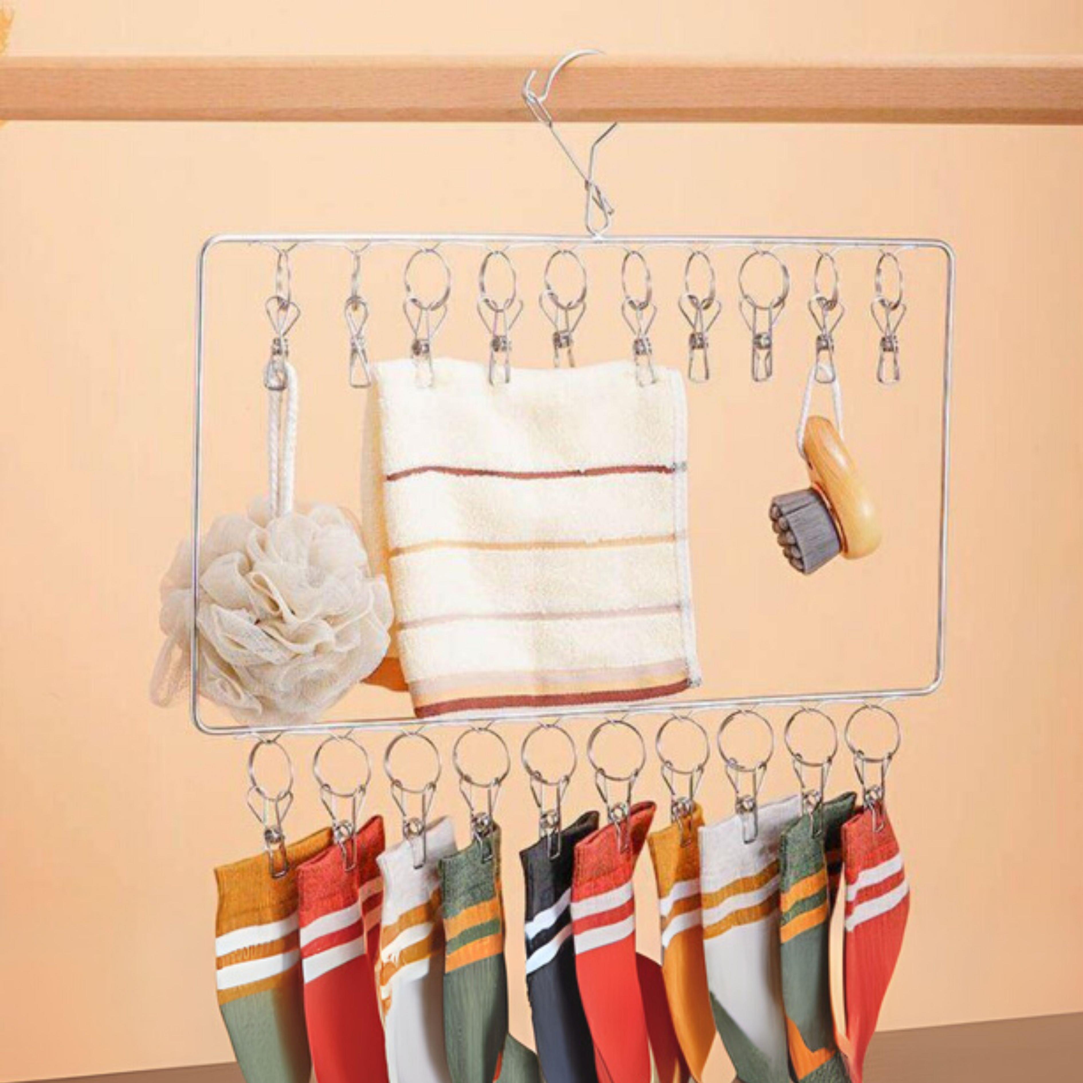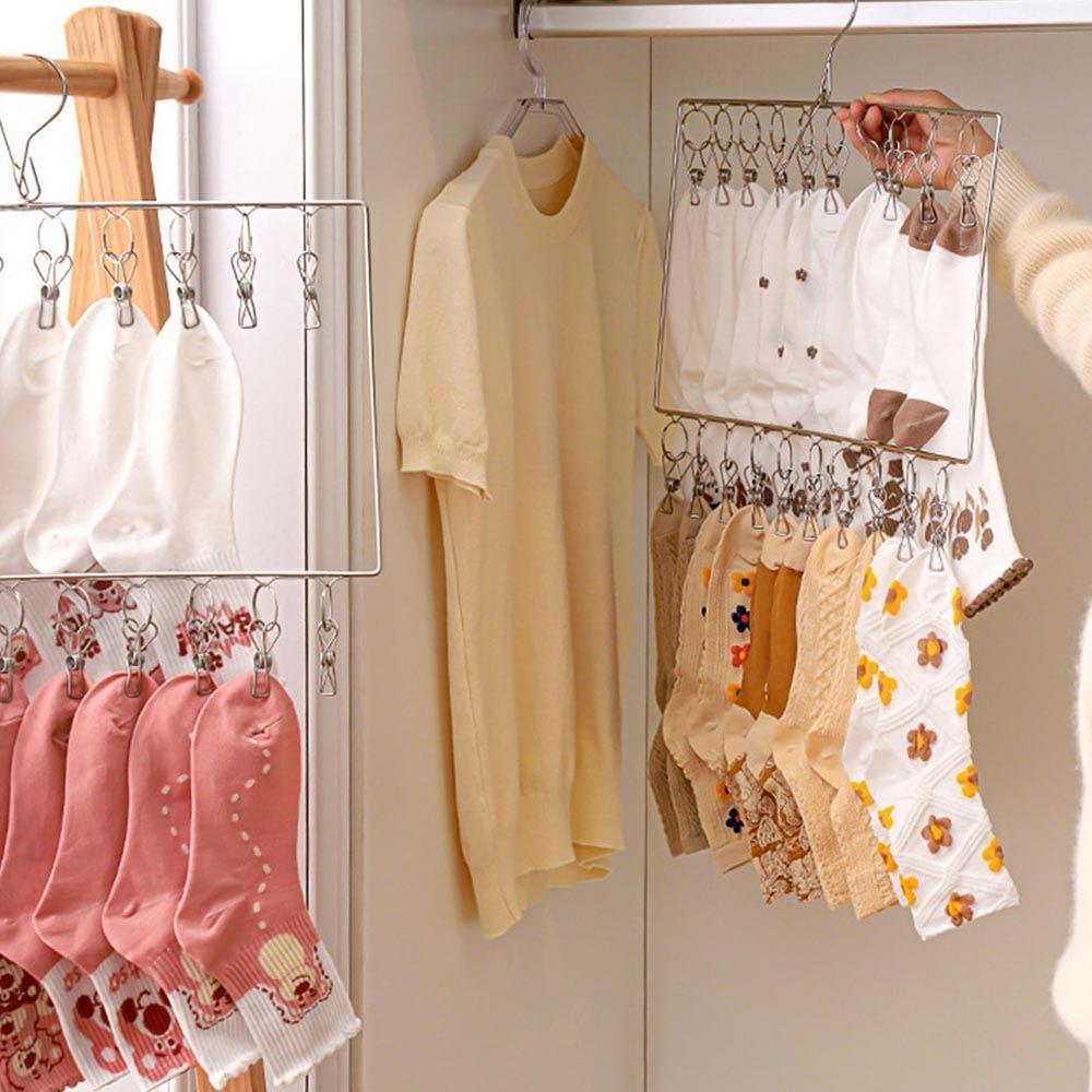 Iubitori ai ordinii și ai tuturor tipurilor de organizatoare pentru casă, fiți atenți! Cu siguranță știți că un dulap ordonat este baza îmbrăcării zilnice. Prin urmare, în depozitare merită ca totul să aibă locul său, mai bine spus un compartiment sau un umeraș – și tocmai unul special avem pentru voi. Acest umeraș simplu, dar totuși absolut grozav, este compus din două rânduri de cleme, pe care puteți agăța nu doar șosete, ci și alte rufe mici, sau de exemplu cravate. Veți economisi spațiu în sertar și de asemenea haosul care poate apărea atunci când căutați un articol specific și sunteți puțin în întârziere. Îl puteți folosi și pentru uscarea rufelor, când nu aveți prea mult spațiu pe uscător sau pe sfoară.